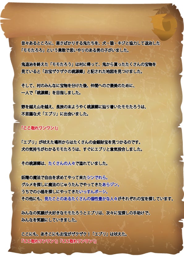 鬼退治を終えた「モモたろう」は村に帰って、鬼から貰ったたくさんの宝物を見ていると「お宝ザクザクの桃源郷」と記された地図を見つけました。