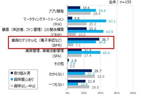 ・その他、すでに取り組み済みとしては、「BPR」が39%と高く、興味関心ありでは、「MA」、「CRM」、「SFA」が4割を超える。