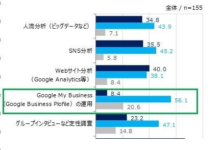 マーケティング調査や分析に関しては、「アンケートなどの定量調査」が67%と最も高く、以下、「Webサイト分析」が40%、「SNS分析」が36%と続きます。興味関心のある取り組みでは、「GoogleMyBusiness(Googleビジネスプロフィール)の運用」が56%と最も高く、以下、「グループインタビューなどの定性調査」が47%、「SNS分析」が45%と続きます。興味関心がない、または、中止した取り組みでは突出した項目は見当たりませんでした。