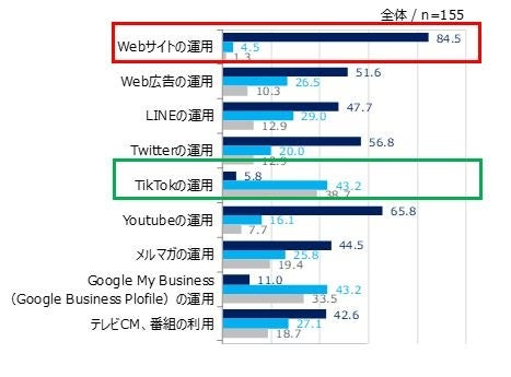 情報発信に関する取り組み状況に関しては、「Webサイトの運用」が85%と最も高く、以下、「YouTubeの運用」が66%、「雑誌広告、雑誌記事の利用」が60%と続きます。興味関心のある取り組みでは、「TikTokの運用」、「GoogleMyBusiness(Googleビジネスプロフィール)の運用」がいずれも43%と、興味はあってもまだ取り組めていない情報発信手段として高くなっています。