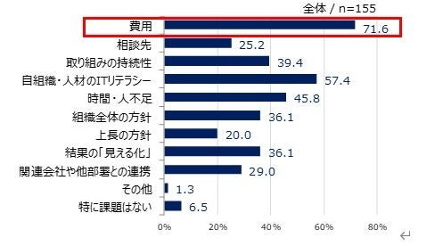 DX推進、デジタル推進についての課題は、「費用」が71.6%と最も高く、以下「自組織・人材のITリテラシー」(57.4%)、「時間・人不足」(45.8%)と続きます。