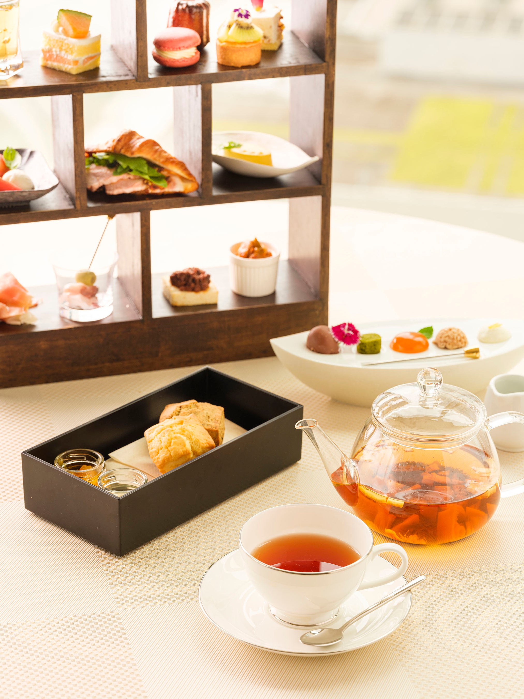 ピスタチオやアールグレイをあわせたスコーン、クロテッドクリーム、こだわりの紅茶と共に、ゆったりと過ごす優雅な時間は贅沢の極み。神奈川県産の食材も用いながらご提供するセイボリー、季節のフルーツを使った彩り豊かなスイーツなどをご用意。エレガントなティータイムをご提供いたします。(1日限定20食)