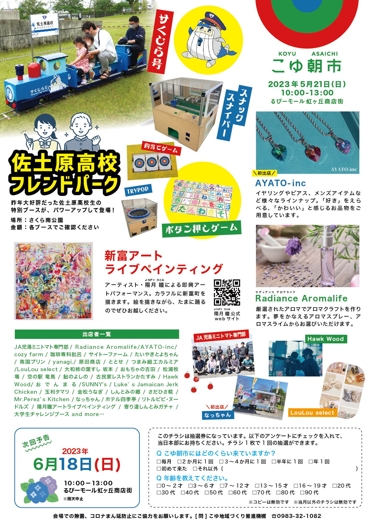 6年目となるこゆ朝市では、大人はもちろん学生によるチャレンジブースも多く出店されてきました。中でも、こゆ朝市5周年の際に初出店となった「佐土原フレンドパーク」は地元佐土原高校の学生らによる企画で、様々なオリジナルゲームや実際に乗車できる列車「サくじら号」が走るなど、多くのチャレンジが詰まっていました。今回開催するこゆ朝市6周年感謝祭では、一部内容を新たにこの「佐土原フレンドパーク」が帰ってきます。未来のエンジニアの技術を結晶した体験型アミューズメントパークを、ぜひお楽しみください。