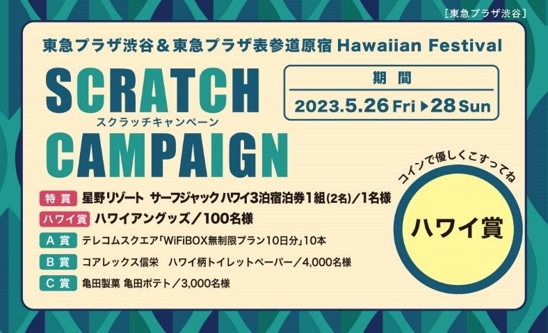 東急プラザ渋谷/東急プラザ表参道原宿の両店において、2023年5月26日(金)より10日間「東急プラザ渋谷/東急プラザ表参道原宿Hawaiian Festival」を開催いたします。期間中は、ハワイホテル宿泊券など素敵なプレゼントが当たるスクラッチキャンペーンやMade in Hawaii ショップ、ハワイアンライブ、ワークショップなど東急プラザ渋谷、東急プラザ表参道原宿がハワイに染まる10日間です。