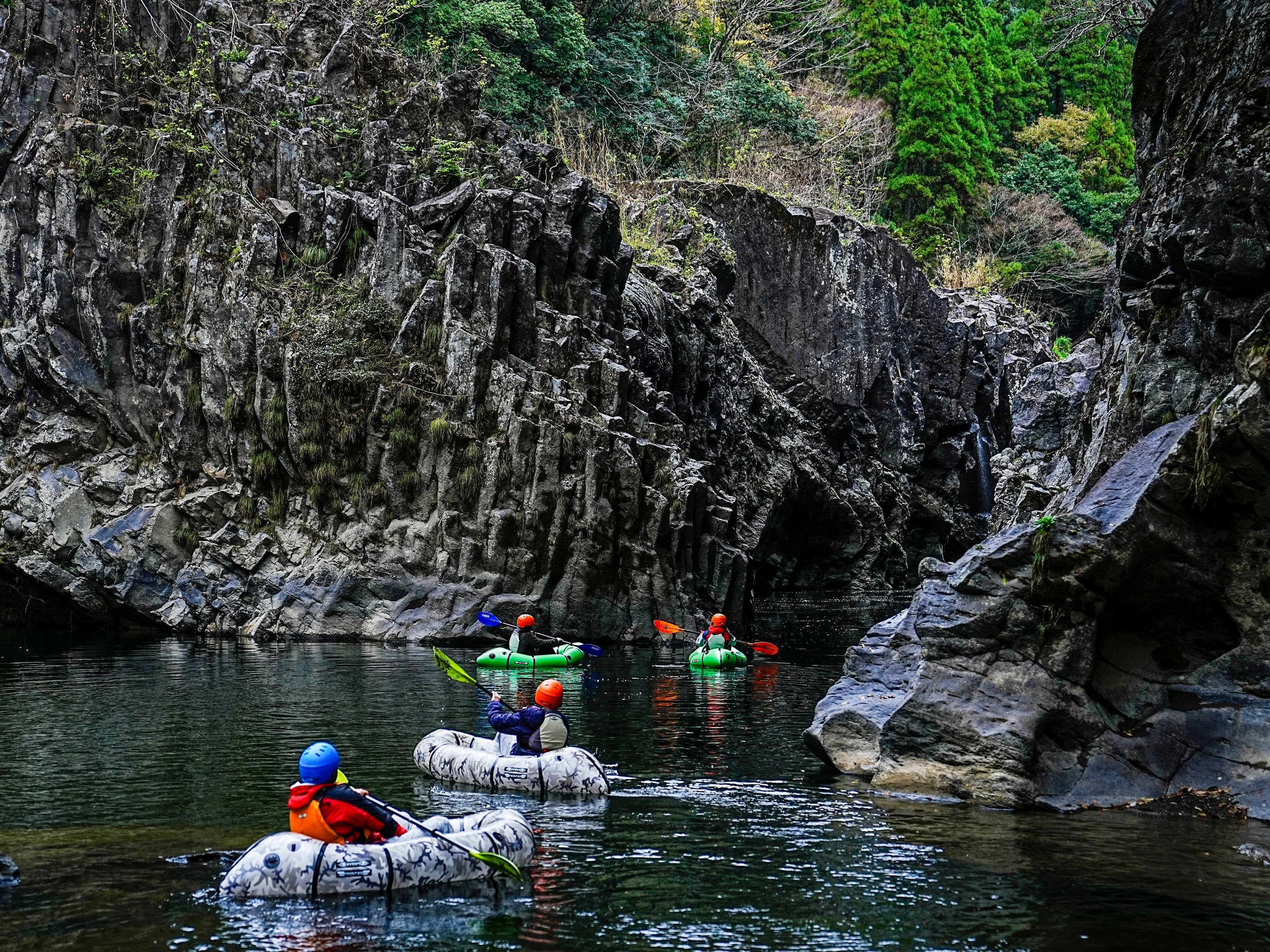 パックラフトとは、持ち運べて空気で膨らますゴムボートで、カヤック等を持って行けない自然の奥地で楽しむことができます。今回、高千穂では、高千穂峡の5キロ上流部に位置し奥高千穂峡とも呼ばれる「尾橋渓谷」を舞台に、地域の方々のご協力を得てパックラフトツアーを造成。