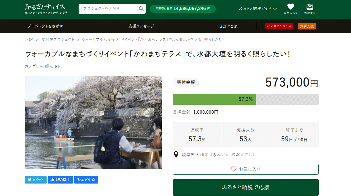 本市では、こうした地域資源を生かし、「水都大垣」らしさを感じられるまちづくりプロジェクト『水都大垣再生プロジェクト』を令和5年度からスタートしました。このプロジェクトの一環として開催する「かわまちテラス」の運営資金をクラウドファンディングで募っています。