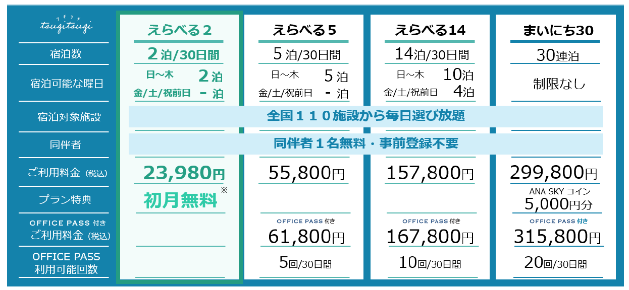 “えらべる5”・“えらべる14”・“まいにち30”に、本サービスをより気軽にご利用いただける“えらべる2”を加えた、計4プランを販売します。また、“えらべる2”プランの新設にあたり「“えらべる2”初月無料キャンペーン」を実施いたします。本サービスは全プランで同伴者様1名まで無料でご利用いただくことができ、利用除外日はございません。各プランの詳細は2023年5月17日公開のサービスサイトよりご確認ください。(https://tsugitsugi.com/)