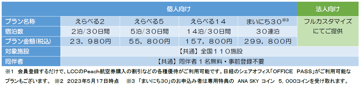本検証結果を踏まえ、2023年5月17日より法人向けプランの販売を開始します。法人向けプランを導入することで、出社でも在宅でもない、新たな働き方として「旅するように働く」ことを可能にします。さらに、全国650カ所以上のシェアオフィスが利用可能な日経のシェアオフィスサービス「OFFICE PASS(オフィスパス)」と組み合わせることで、すき間時間を含め、全国どこでも働くことを可能にします。