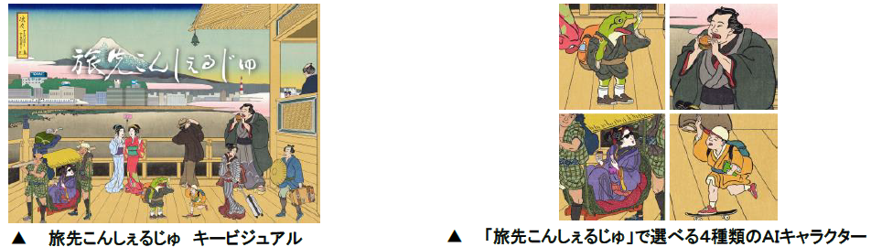 対象施設が拡大するにつれ、「どこに行くべきか悩んでしまったため、旅先や宿泊施設のおすすめや提案が欲しい」という利用者の声が多く集まったことから、chatGPTの技術を活用した “個性を備えた人間らしい”AIコンシェルジュ機能「旅先こんしぇるじゅ」を導入します。キービジュアルは浮世絵イラストレーターのNAGA氏による描き下ろしで、ストリートカルチャーと浮世絵が融合した世界感を味わいながら相談が可能です。4種類のAIキャラクターは詳しい分野や性格が異なるため、質問に対する回答にも個性が表れ、本サービスをより楽しくご利用いただけます。無料会員登録後の利用者は誰でも利用可能です。
