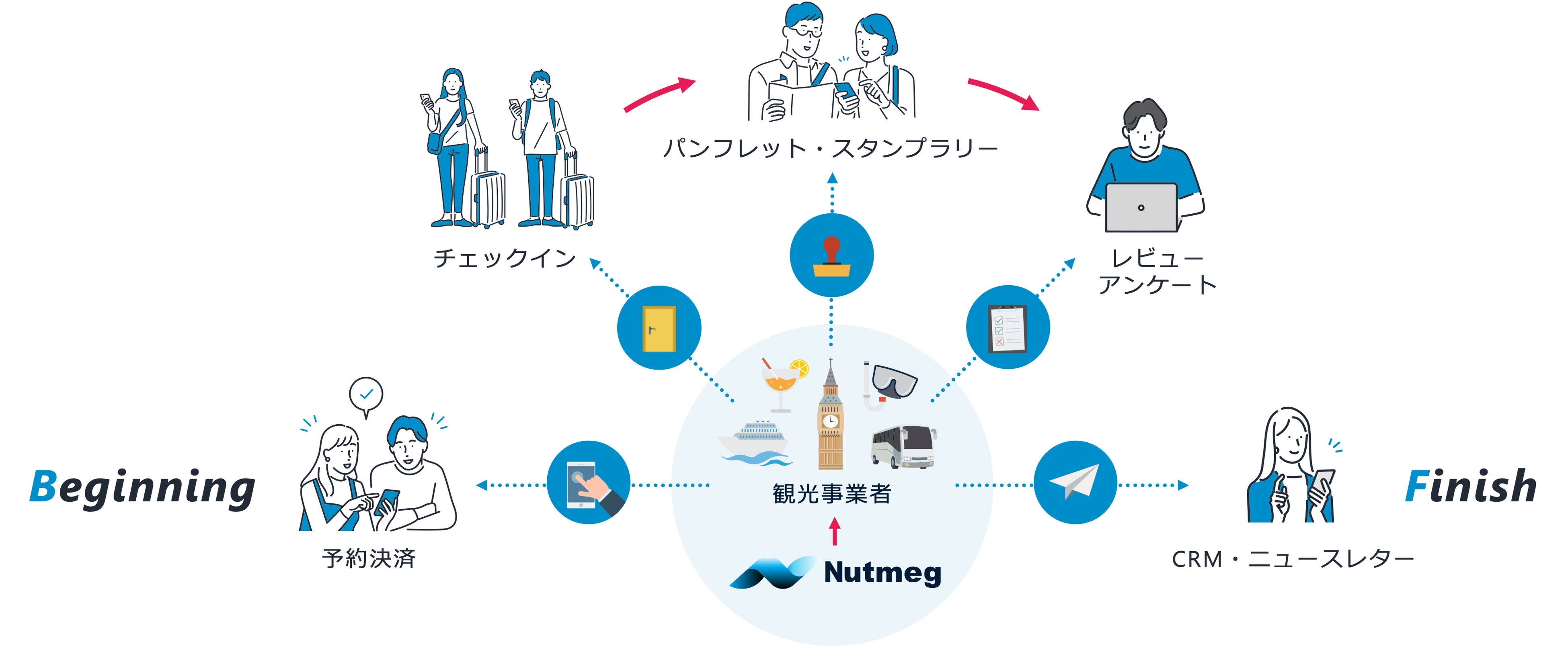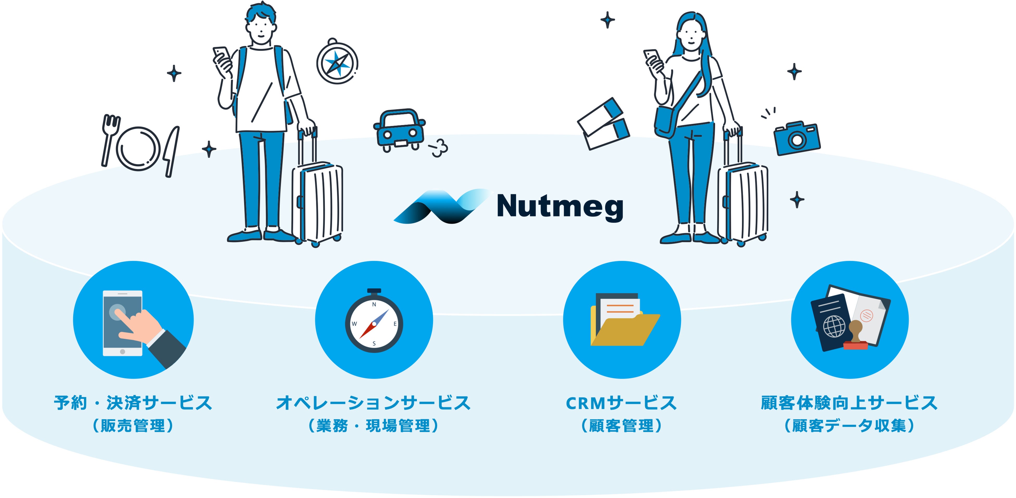 当社は、「現地体験をもっと楽しく・もっと豊かに・もっと身近に」をミッションに、2021年1月より予約・決済から、現場レベルの業務まで一気通貫でデジタル化を可能にする観光DXプラットフォーム『Nutmeg(ナツメグ)』を提供しています。