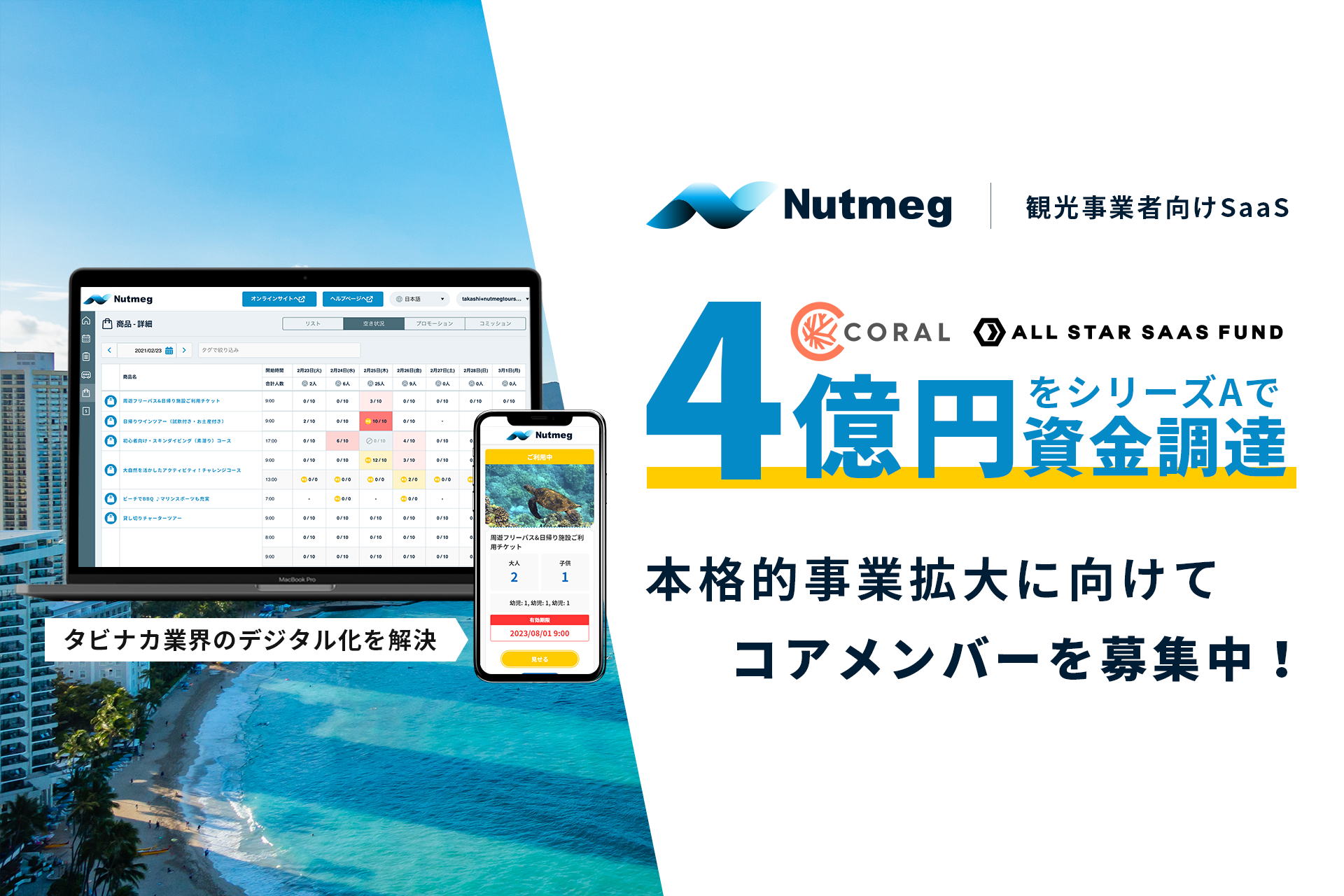 このたび調達した資金は、「Nutmeg」の開発および営業体制の強化にあてる予定です。今後は業務効率化に留まらず、顧客体験を高める各種デジタルサービスの導入や、リピーターの増加等直販売上の向上につながる総合的な仕組みを構築してまいります。Nutmegは、観光の現場における非効率をなくすとともに、日本経済活性化の鍵となる約2,000万人を超す訪日外国人客のスムーズな受け入れを観光事業者レベルで支援し、世界中の観光客がより現地体験を楽しめる「自由なタビナカ」を目指してサービスを提供してまいります。