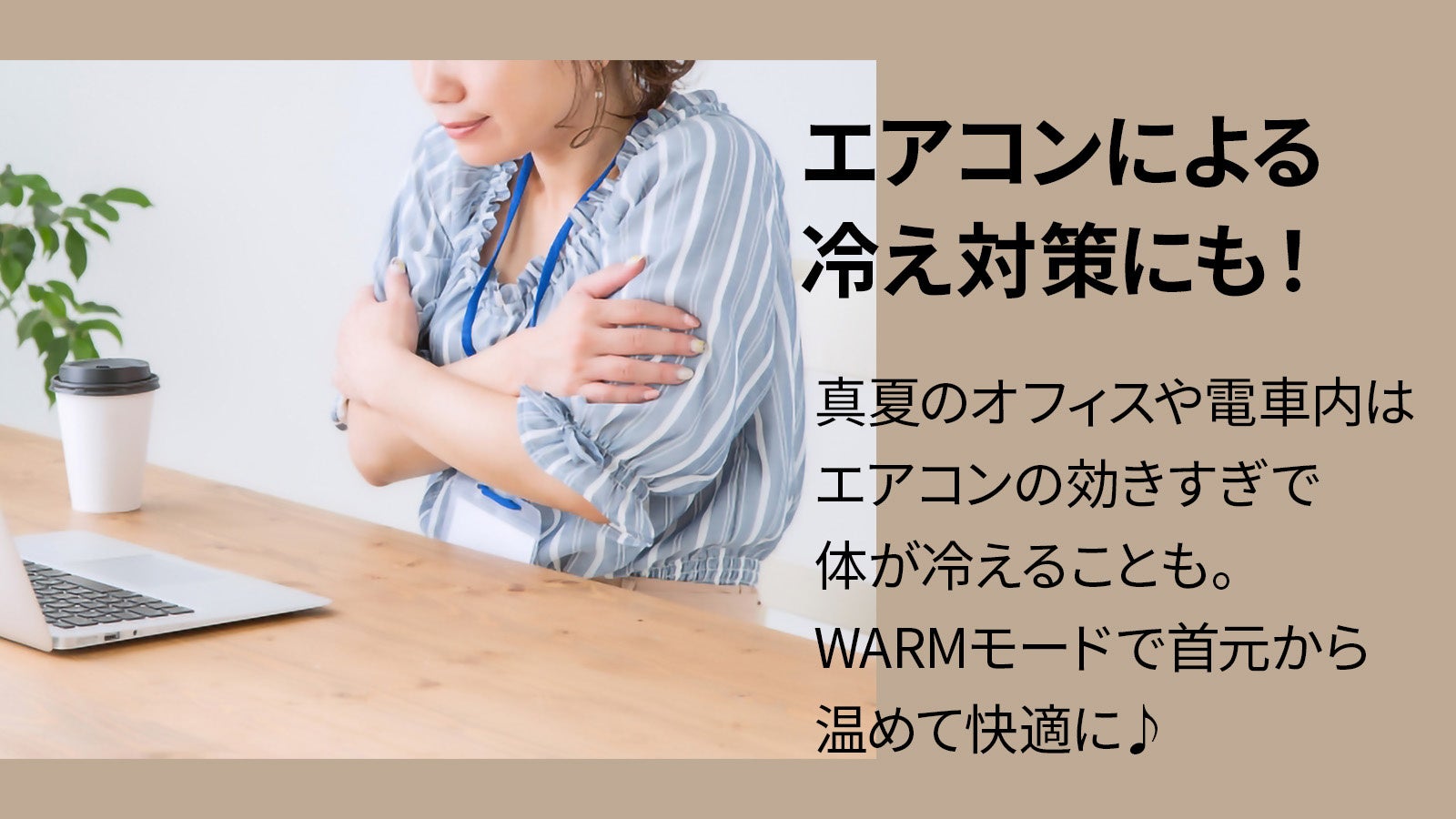 冬だけでなく、オフィスの席の位置によって冷房が効き過ぎていると感じるときなど、まるでカイロのように首から身体を温めることができます。