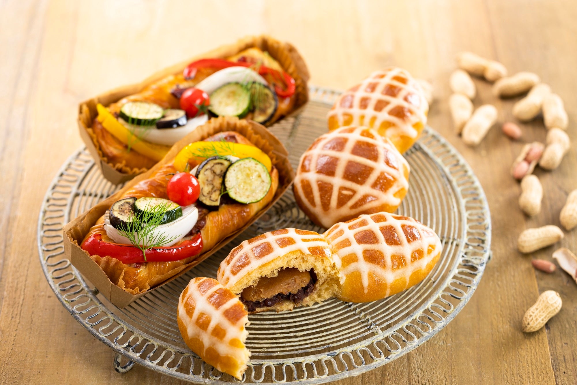 千葉県産の豚を使ったベーコンをのせて焼き上げたデニッシュに、スモークした玉ねぎ、なす、パプリカなどのグリル野菜を盛りつけました。ベーコンやスモークした野菜が香る、具だくさんの惣菜パンです。
