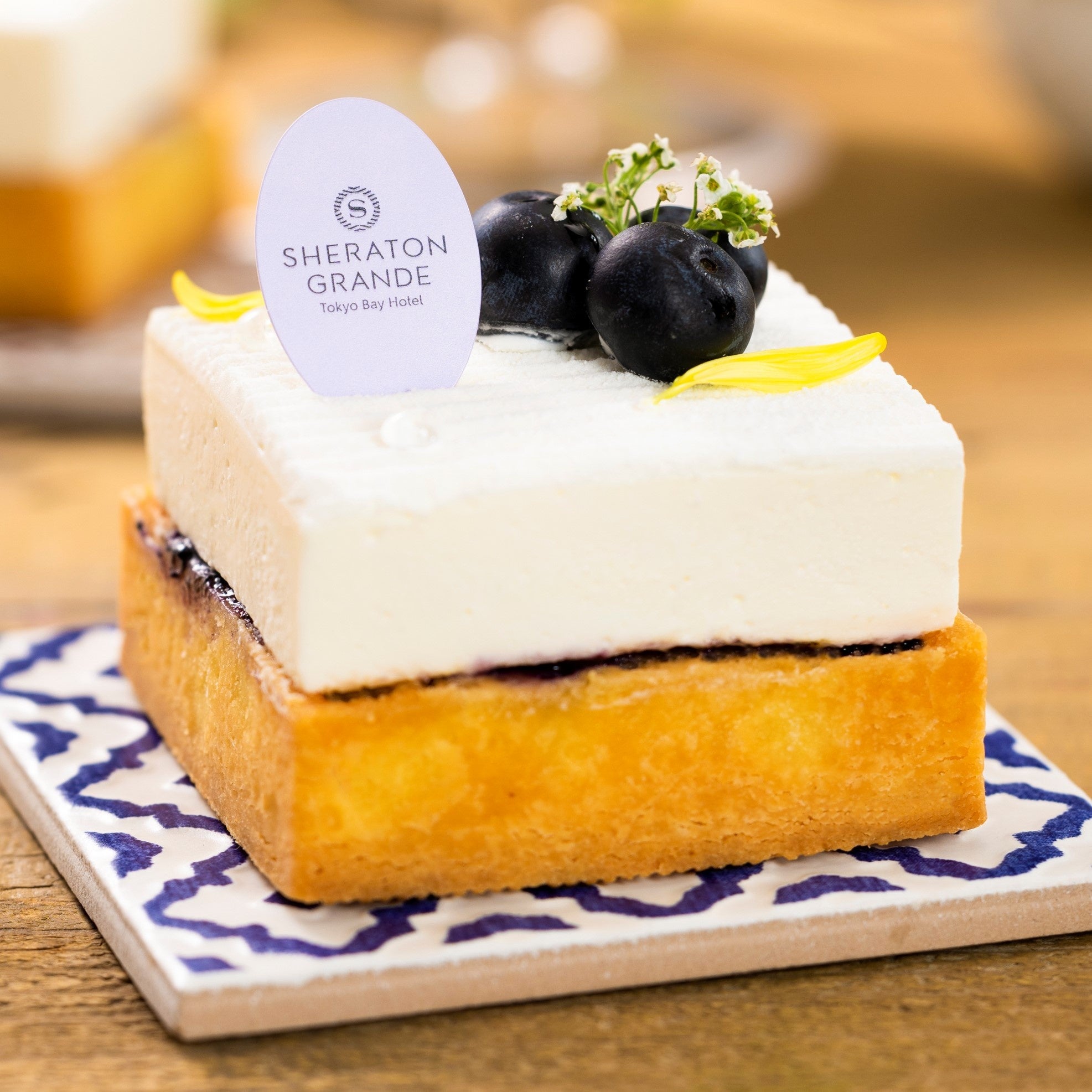 正方形のフォルムが斬新なチーズタルトです。千葉県産のブルーベリーや菜の花はちみつの入ったタルトの上に、真っ白なレアチーズケーキを大胆にのせました。コクのある柔らかな口当たりのレアチーズと、すっきりとした酸味のブルーベリーが相性抜群です。