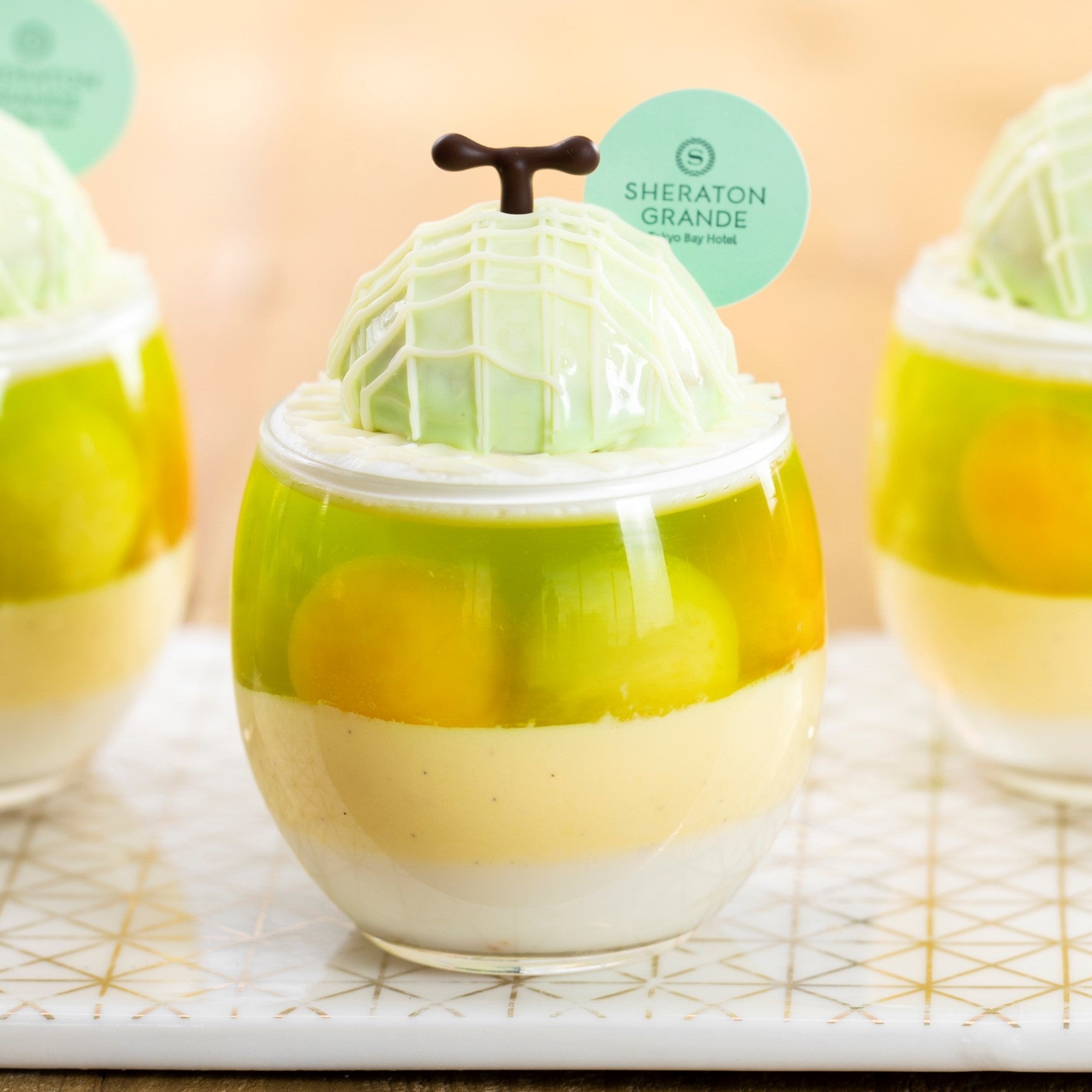 メロンに見立てたムースが印象的な、見た目にも爽やかなグラスデザートです。メロンゼリーの中から覗く千葉県の特産品であるアクアメロンと、濃厚な甘さが特徴のタカミメロンの大きな果肉が口いっぱいに広がります。透明感溢れる初夏にぴったりのスイーツです。