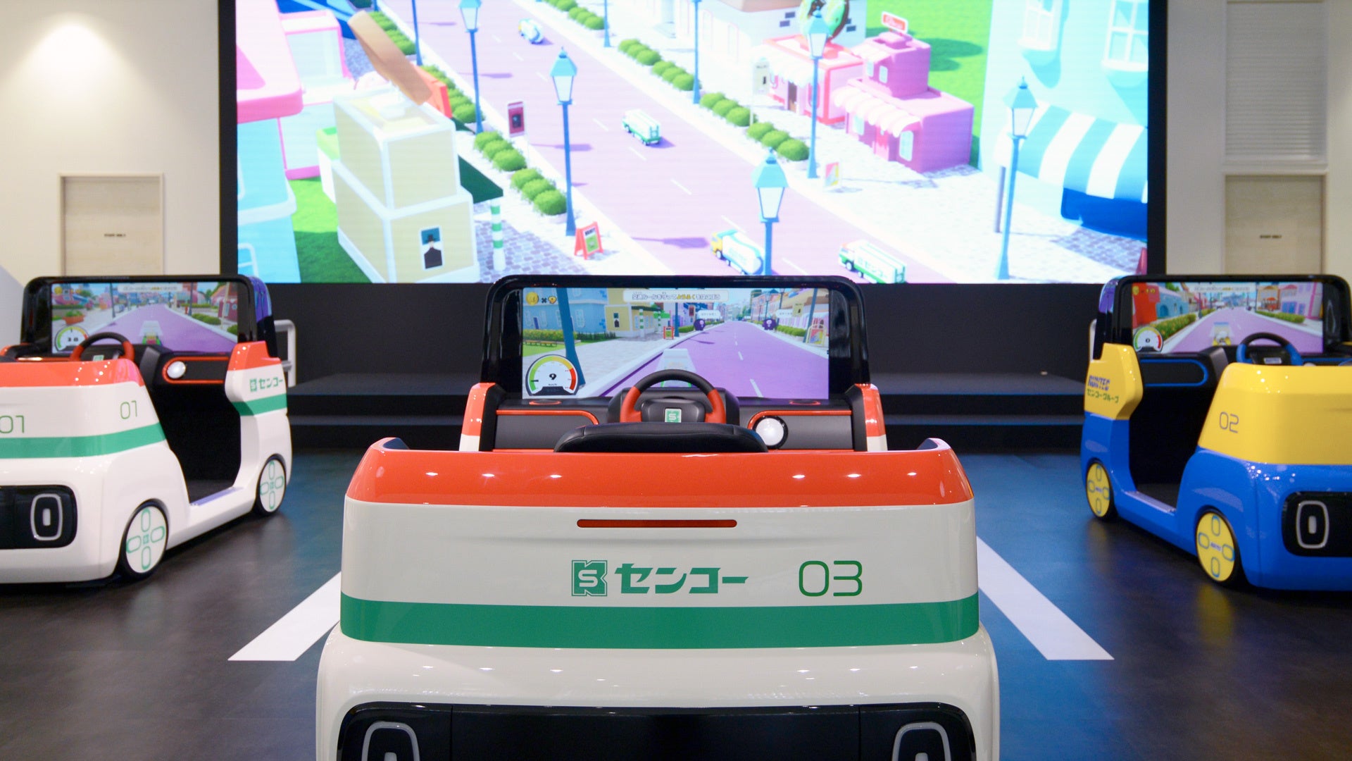 また、前方にある大型LEDモニターには、バーチャル世界で運転を楽しむ子どもたちの進行状況がリアルタイムに投影され、アトラクションの周りで見守る方々も一緒に楽しめる一体感を持たせる空間演出も施しています。