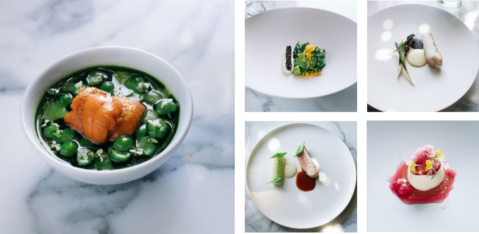 エンドウ豆のカスタードに余市産の雲丹を使用したクリーミーなソースを重ね、トップにはフレッシュな雲丹とエンドウ豆、香り高い三つ葉オイルがうま味を引き立てます。