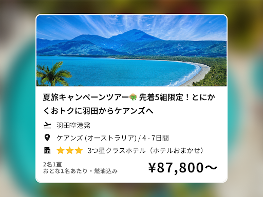 また、ハワイに加えてオーストラリア北端のリゾート都市として有名なケアンズもラインアップ。羽田発の直行便ツアーが先着5組限定で87,800円~とこちらもおトクなツアーとなっております。