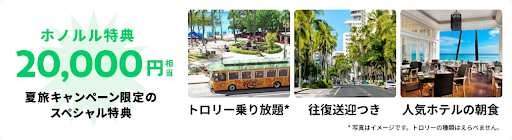 今回のキャンペーンでは夏に人気の旅行先を中心におトクなプランをご用意しております。特にファミリーに人気のホノルルは、全てのプランで「トロリー乗り放題」「空港〜ホテル間の往復送迎つき」「モアナサーフライダー『ザ ベランダ』朝食ビュッフェつき」というスペシャル特典をご用意いたしました。