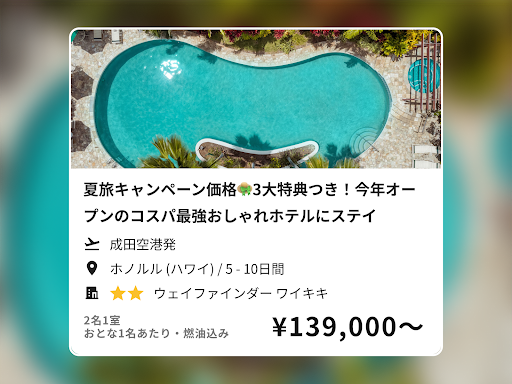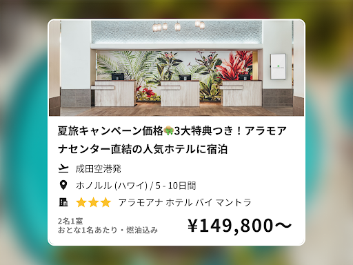 2022年4月からサービスを開始した海外旅行予約アプリ『NEWT(ニュート)』でも、夏休みなど海外旅行の人気シーズンに向けてより多くのお客様に”かんたん・おトク・えらべる・あんしん”な海外旅行を楽しんでいただこうと考え、今回のキャンペーンを開始いたしました。