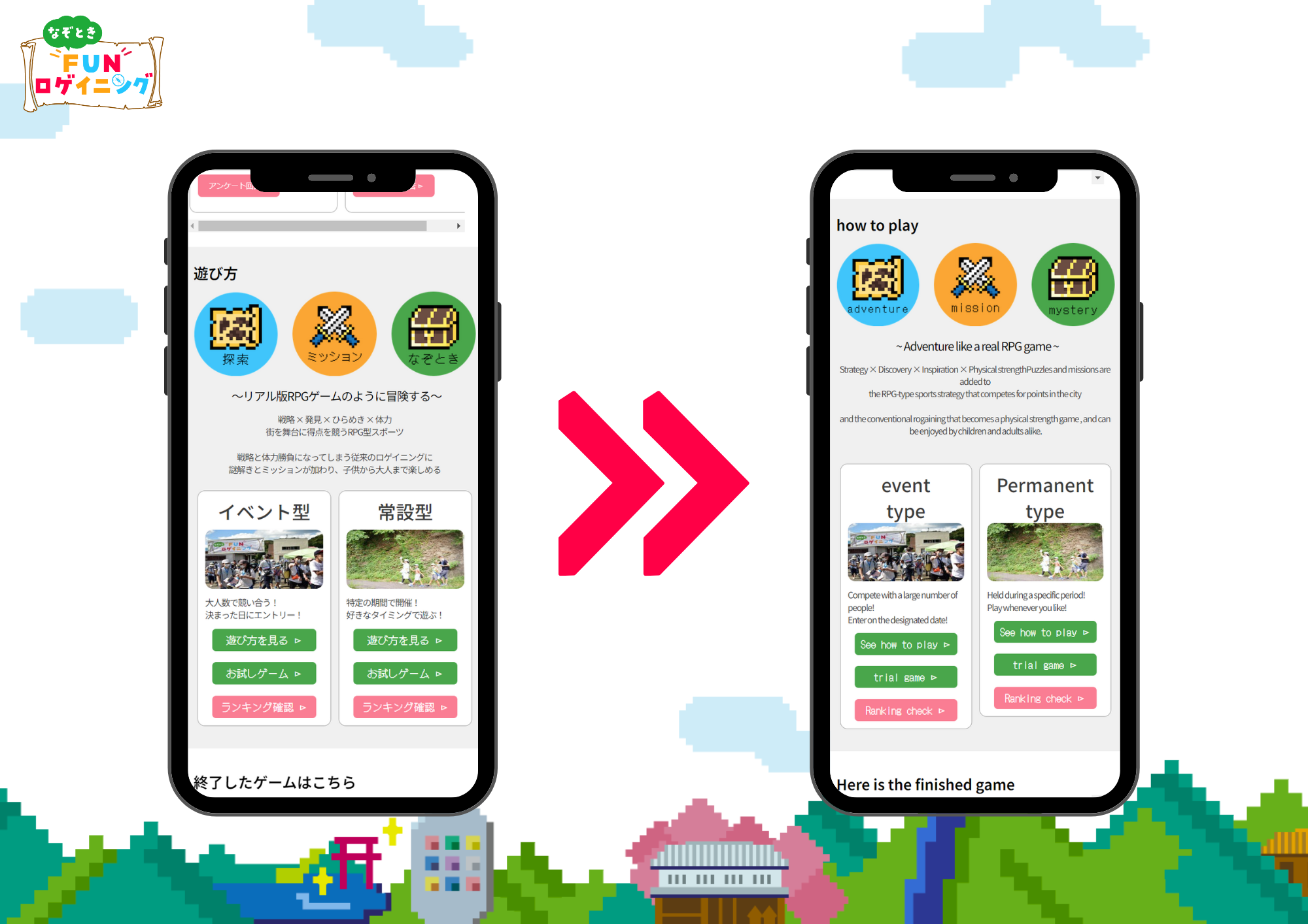 新感覚スポーツ「なぞときFUNロゲイニング」、ロゲイニング専用アプリ「FUNロゲ」で、あらゆる”場所”の魅力を引き出しRPG化することで、今までになかった周遊の楽しさを提供している。