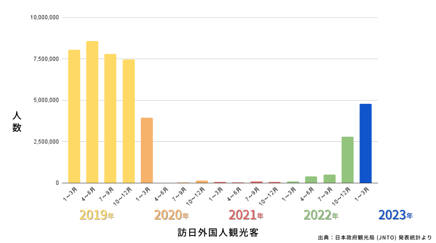 新型コロナウイルスの規制緩和に伴い、以下のグラフのように2023年の1~3月にはコロナ前の約2/3ほどの水準まで外国人観光客数が回復傾向にあり、各地域でインバウンド向けの対策が求められています。