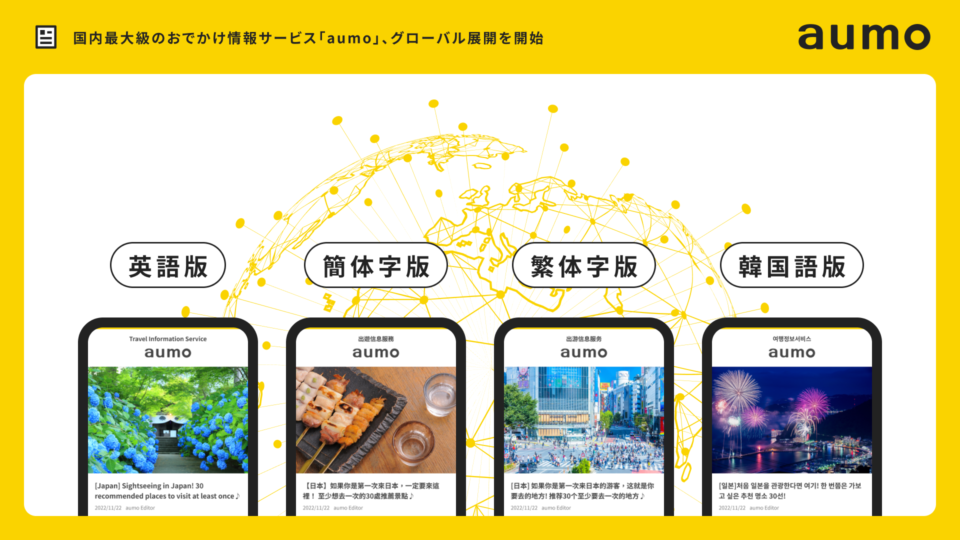 aumoでは多言語のメディア展開を進め、グローバルNo.1のおでかけ情報サービスを目指し、今後は訪日観光客やアウトバウンド旅行客の他に、海外の方に向けたおでかけ情報の提供も推進していきます。