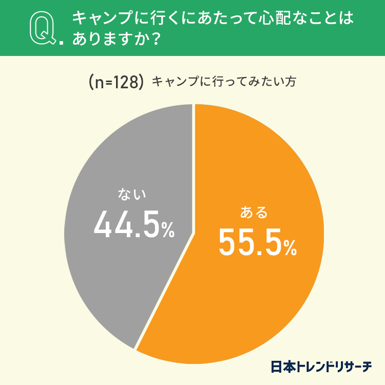 55.5%と半数以上の方が、キャンプに行くにあたって、「〇〇で失敗してしまいそう」という心配なことが「ある」と回答しました。
