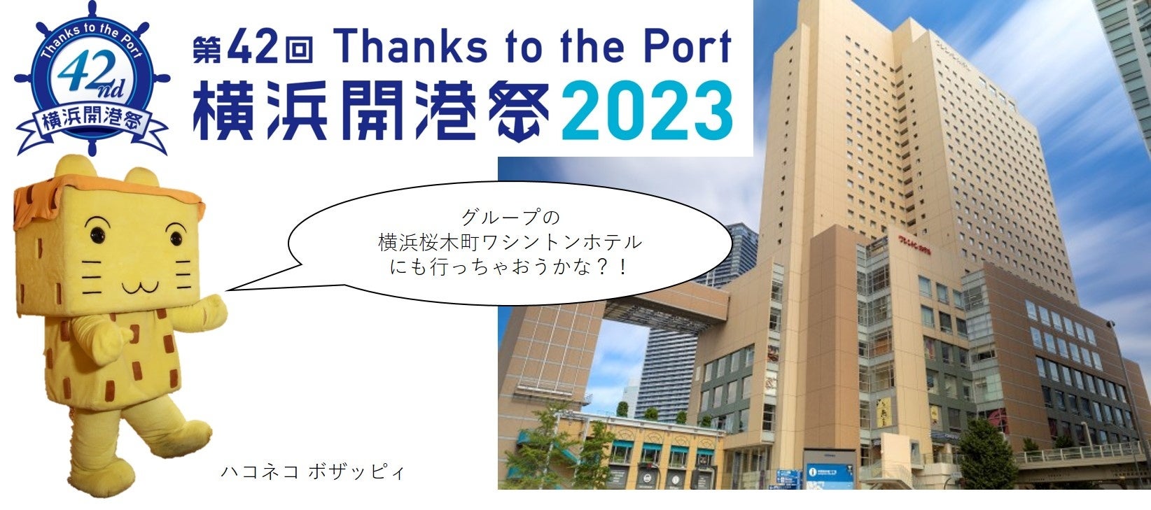 今年で開港から164年を迎える横浜。ユネッサンの公式キャラクター「ハコネコ ボザッピィ」は光栄にも「第42回横浜開港祭 ~Thanks to the port 2023~」にご招待いただきました。横浜開港祭のキーワードの一つが「感謝」。箱根が今日、国際的な観光地として世界中にその名が知られるようになったのは、横浜開港がきっかけでした。そこで、横浜開港への感謝の気持ちをこめ、横浜市民の皆さまにユネッサンを楽しんでいただきたく、特別な割引をご用意いたしました。
