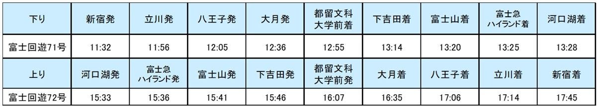 これまでの「富士回遊」と同じく、新宿駅、立川駅、八王子駅、大月駅、都留文科大学前駅、下吉田駅、富士山駅、富士急ハイランド駅、河口湖駅に停車いたします。