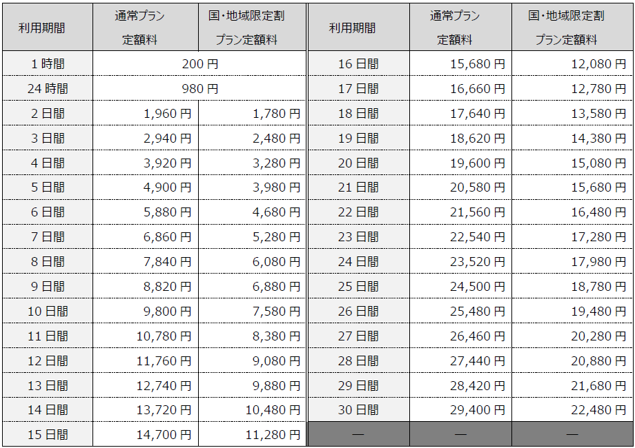 ※ 「国・地域限定割プラン」を利用開始後、「通常プラン」のみ対象の国・地域に移動した場合、データ通信は停止され、利用可能時間の残り時間に関わらず「国・地域限定割プラン」の定額料がかかります。「通常プラン」をご利用になる場合は渡航先での利用開始操作が必要になり、新たに定額料がかかります。