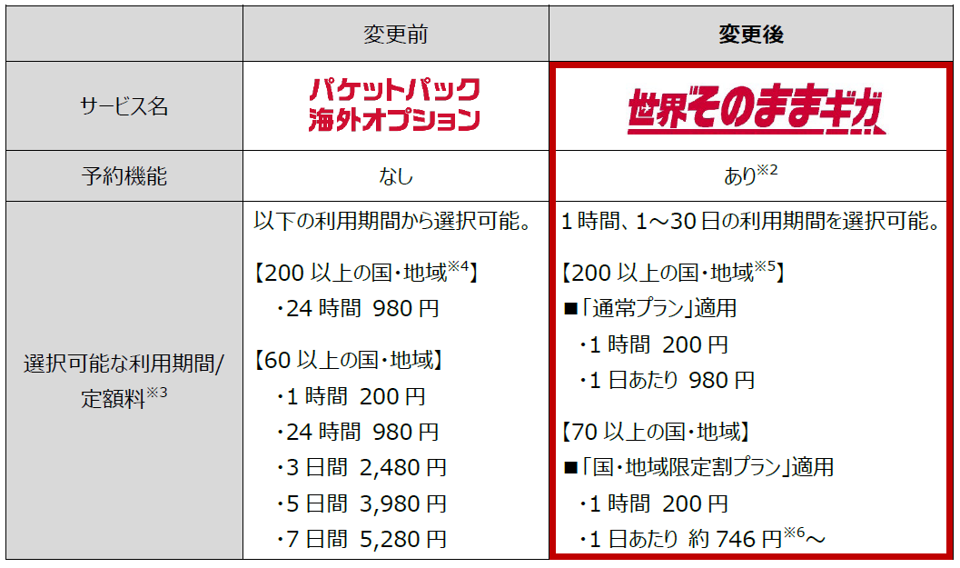 ※ 現在、「パケットパック海外オプション」「海外パケ・ホーダイ」をご契約中のお客さまは、それぞれ「世界そのままギガ」「世界ギガし放題」のご利用にあたり個別に必要な手続きはございません。5月中に「世界そのままギガ」「世界ギガし放題」をご利用された場合、6月請求分の請求書に旧サービス名称が表示されることがありますが、ご請求金額は正しく表示されます。