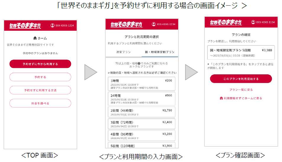 ※ 「世界そのままギガ」の「国・地域限定割プラン」とは、「国・地域限定割プラン」対象国・地域内限定でご利用になれるプランをさします。「世界そのままギガ」の「通常プラン」とは、「世界そのままギガ」対象国・地域のすべてでご利用になれるプランをさします。
