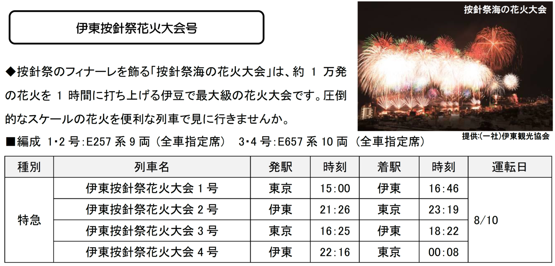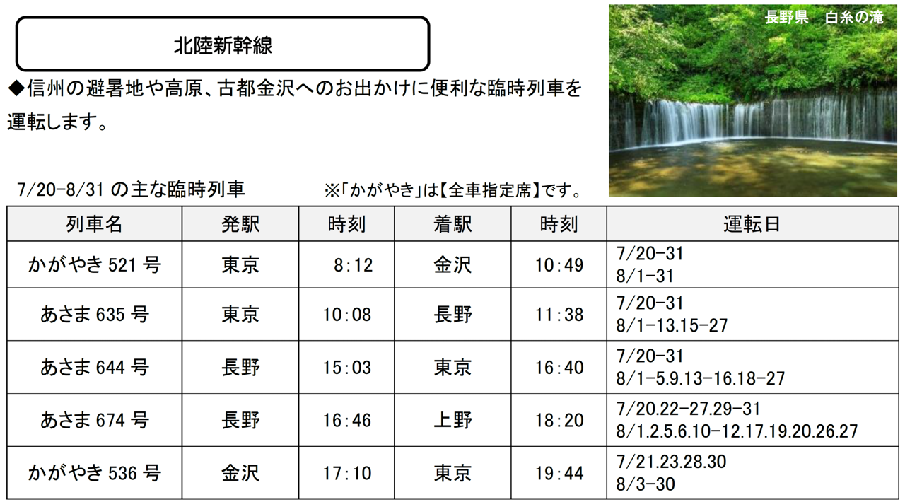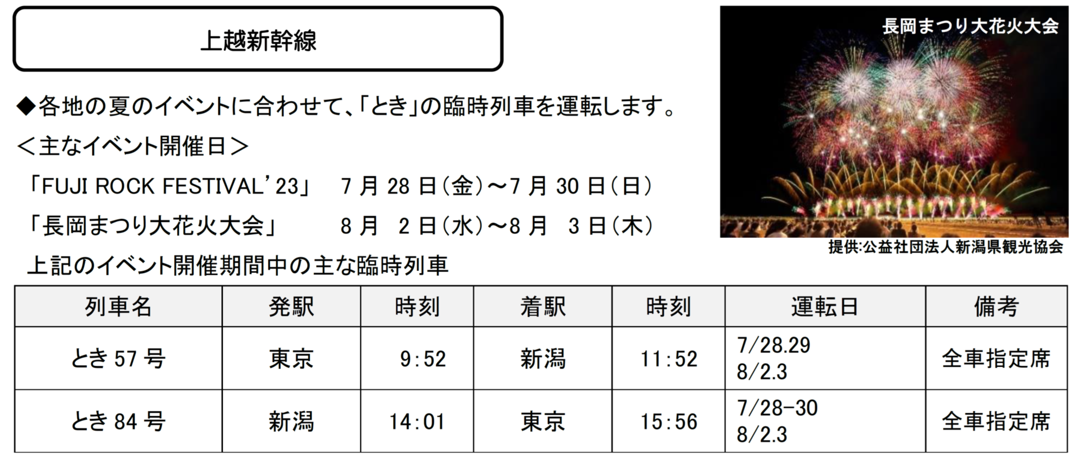 2023年7月1日(土) ~ 9月30日(土)の期間に、各地で夏のイベントに便利な列車を運転します。また、夏休みやお盆期間を中心に、首都圏と各地を結ぶ新幹線・特急列車を増発します。 |