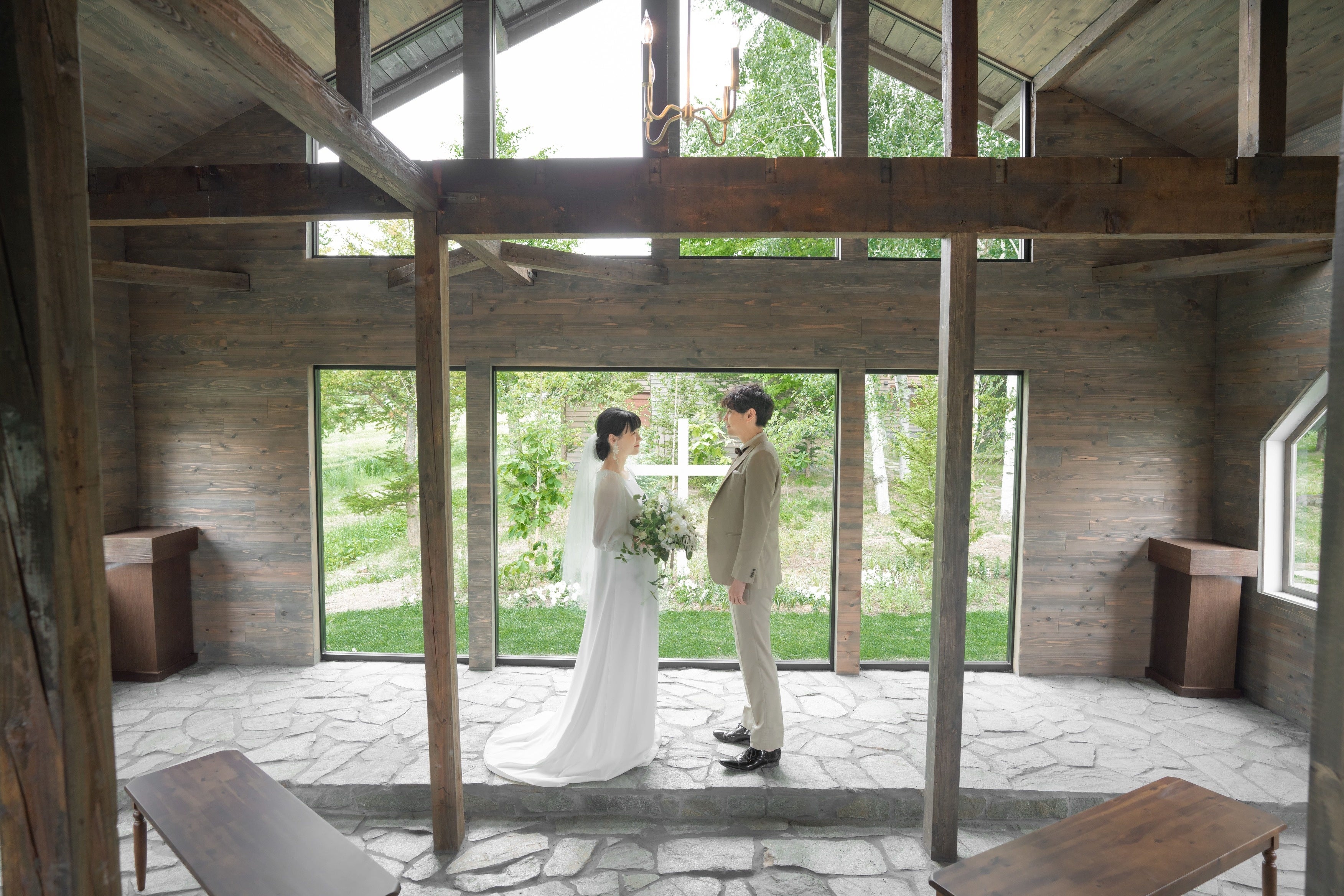 美瑛を代表する花園「四季彩の丘」や、動物とふれあいながら撮影を楽しめる「ファームズ千代田」など、人気スポットへのアクセスが良好な「スタジオSOLA 美瑛店」は、2022年7月にリニューアルオープンしました。敷地内には、ご家族やご友人を招いての撮影もできる独立型のチャペルも設置。緑に囲まれ木の温もりを感じるチャペルで結婚式と同じように、指輪の交換や結婚証明書へのサイン、親御様へ感謝の気持ちを伝える場を設けるなど、ウェディングセレモニーも行えます。