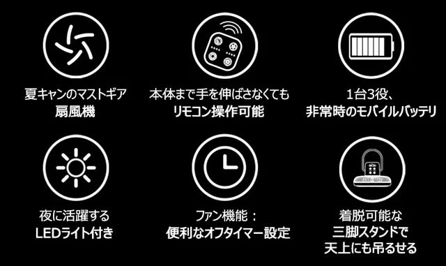 コードレス扇風機+LEDライト+モバイルバッテリーの1台3役。