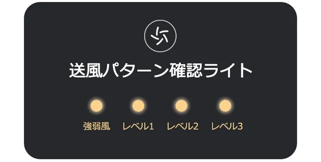 風量調節は4パターン搭載されており、(弱~強・弱・中・強)と、ボタン操作で切り替えることができます