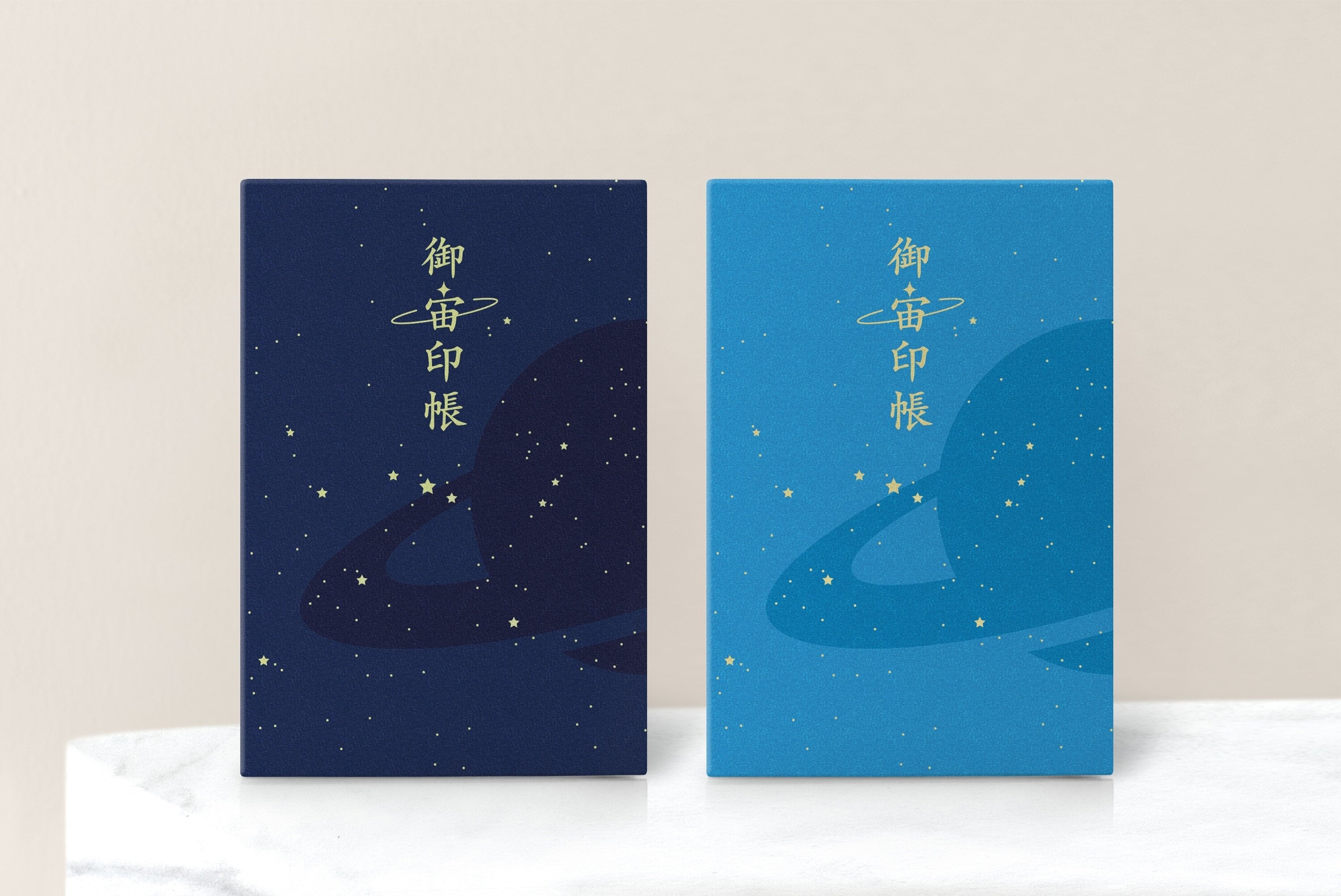 表紙には、デザインされた「御宙印帳」ロゴと、背景には、夏の夜空が描かれています。カラーは濃い青と薄い青の2色です。中は通常の「御朱印帳」と同じく、ジャバラ式24折の両面