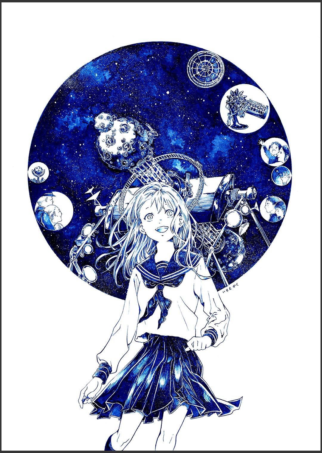 私たちが宇宙を楽しむ「星空」と「プラネタリウム」を背景に、プラネタリウムの歴史と、宇宙を楽しむ人々の時の流れを1枚のイラストに纏めて頂きました。