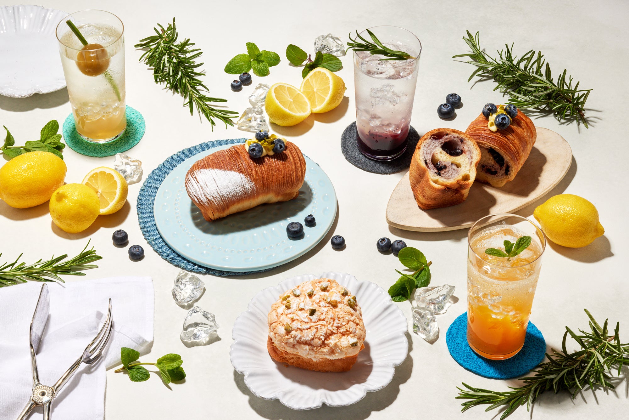 ブレッドは、夏フルーツをデニッシュとマカロン生地にバランスよく配した「ココナッツとマンゴーのブリオッシュ」に、パリパリと軽い食感のフィユタージュが印象的な「ブルーベリーデニッシュ」。