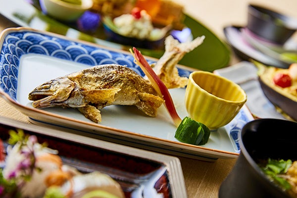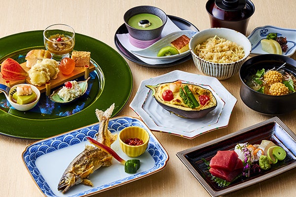 特選昼会席では、漁が解禁となった若鮎をシンプルに塩焼きで素材の味を活かし、またアスパラガスの鮮やかな緑色を新緑に見立てた新緑豆腐を前菜でご堪能いただけます。また、果肉が密な米茄子を魚介と共に焼き上げた「米茄子クリーム田楽」もおすすめの逸品です。季-とき-会席からはスタミナアップ食材の鰻を「鰻ざく」にて、また食事はさっぱりとお召し上がりいただける「新生姜御飯」など、会席の随所で初夏を感じていただけます。