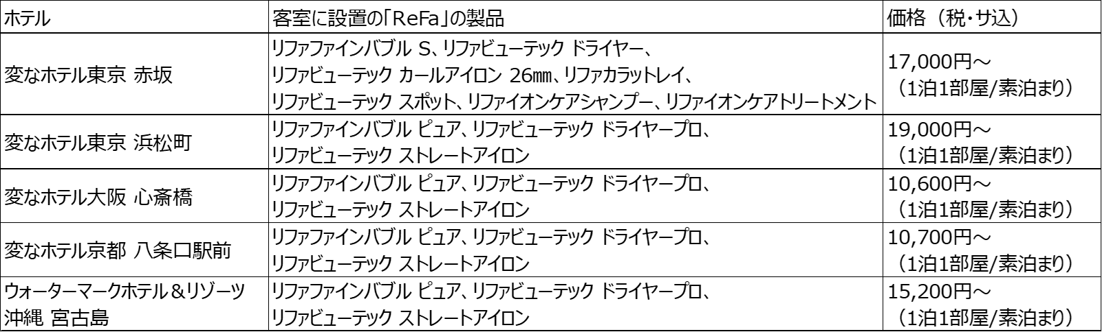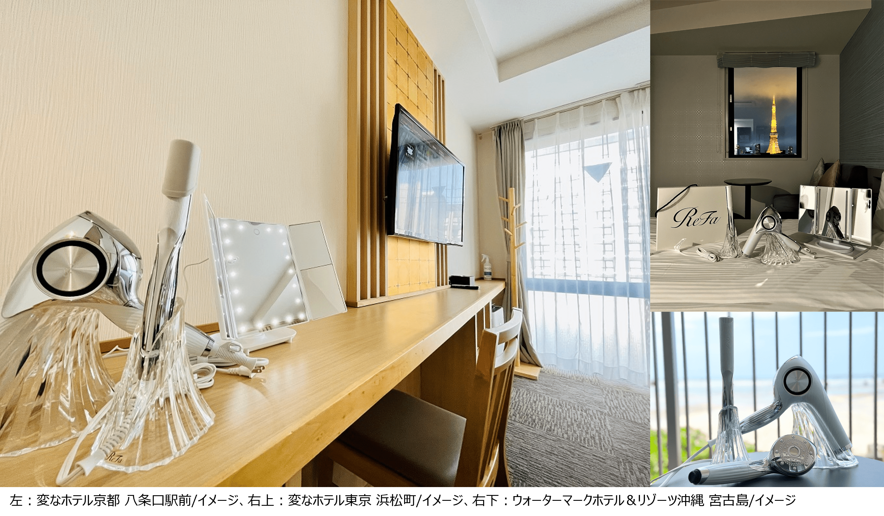 変なホテル東京 赤坂、変なホテル東京 浜松町、変なホテル大阪 心斎橋、変なホテル京都 八条口駅前、ウォーターマークホテル&リゾーツ沖縄 宮古島の5ホテルにて、大人気の美容ブランド「ReFa」の製品を設置した「ReFaルーム」を展開いたします。「ReFaルーム」では「ReFa」の製品を体験し、購入することが可能です。「美」を追求されるお客様にも、仕事後に気軽にご宿泊いただくお客様にもご満足いただける、「美」にこだわった充実したホテル滞在をご提供いたします。「ReFaルーム」には、「ReFa」のシャワーヘッド、ドライヤー、ヘアアイロンを導入し、LEDライト付き三面ミラーを設置、C.O.Bigelowまたは雪肌精のスキンケアセットをご用意しております。さらに、変なホテル東京 赤坂では「ReFa」の美容ロ―ラー、美顔器、シャンプー、トリートメントも導入しております。