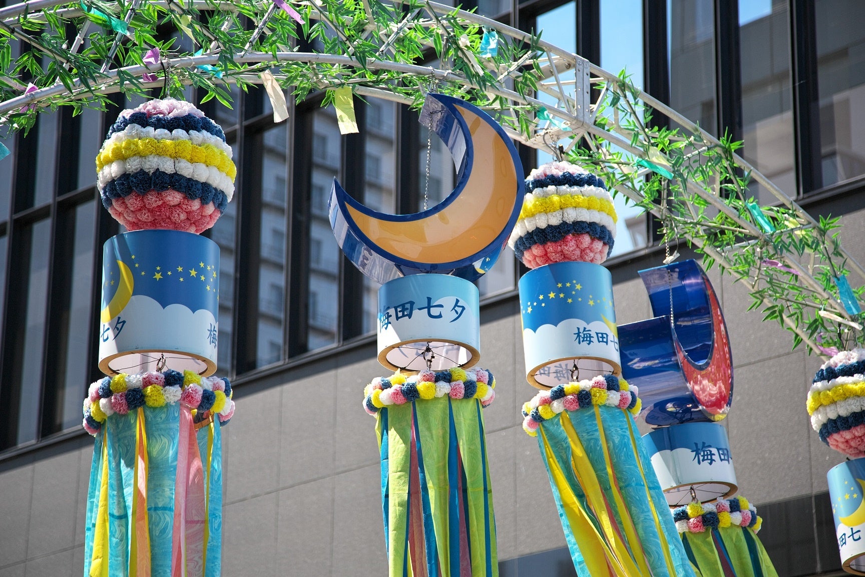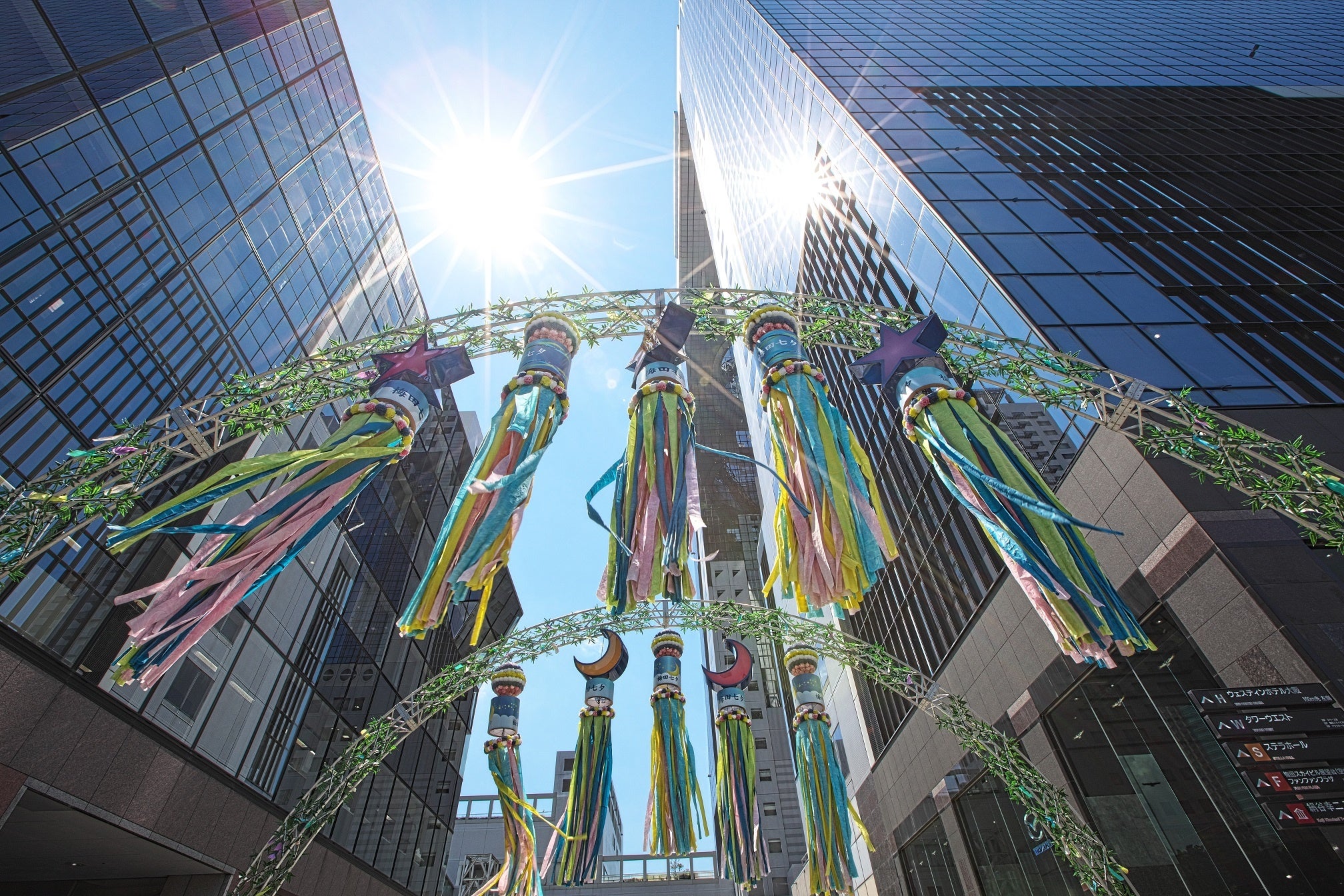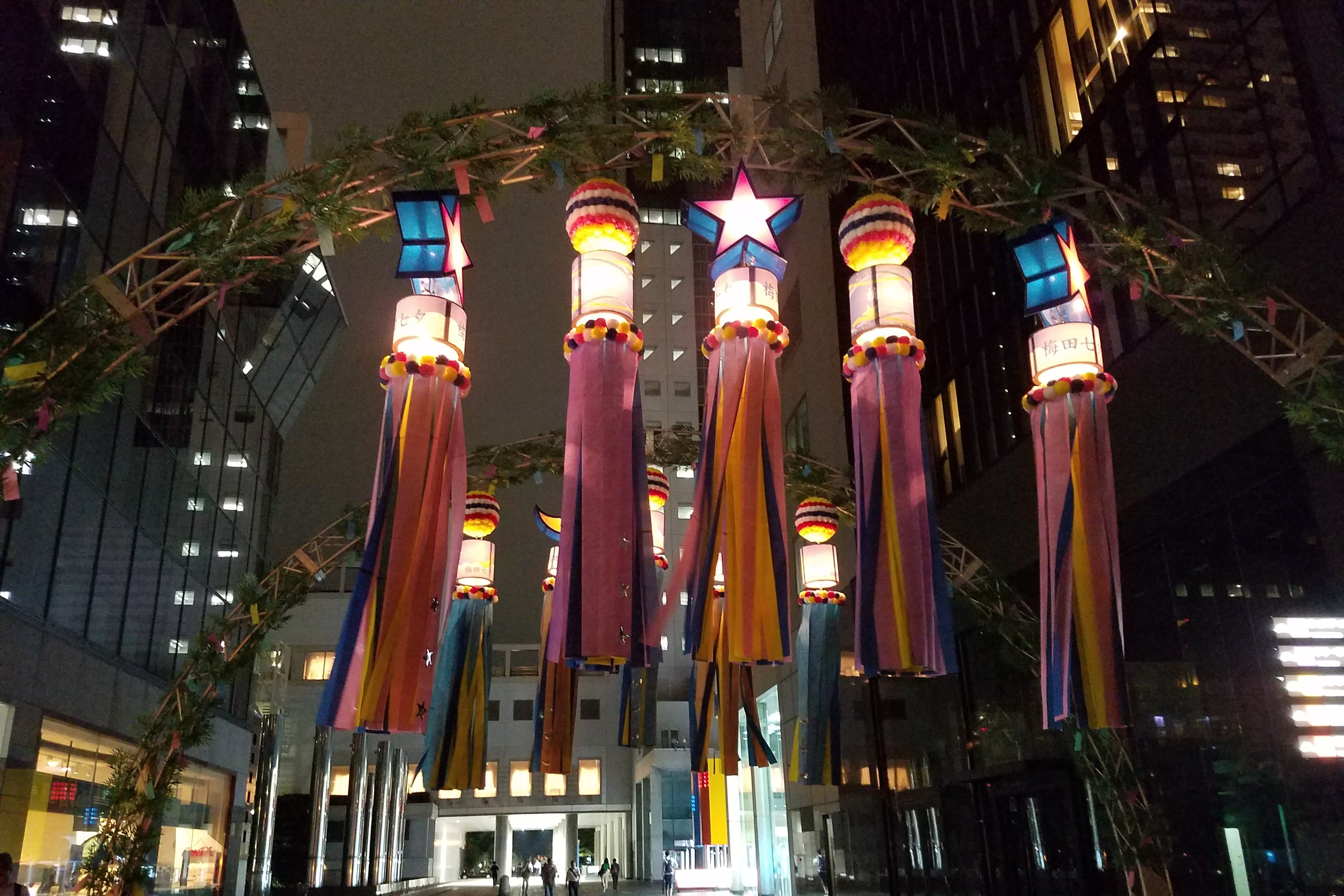 新梅田シティ入口の巨大アーチには吹き流しと呼ばれる七夕飾りが目を引くほか、