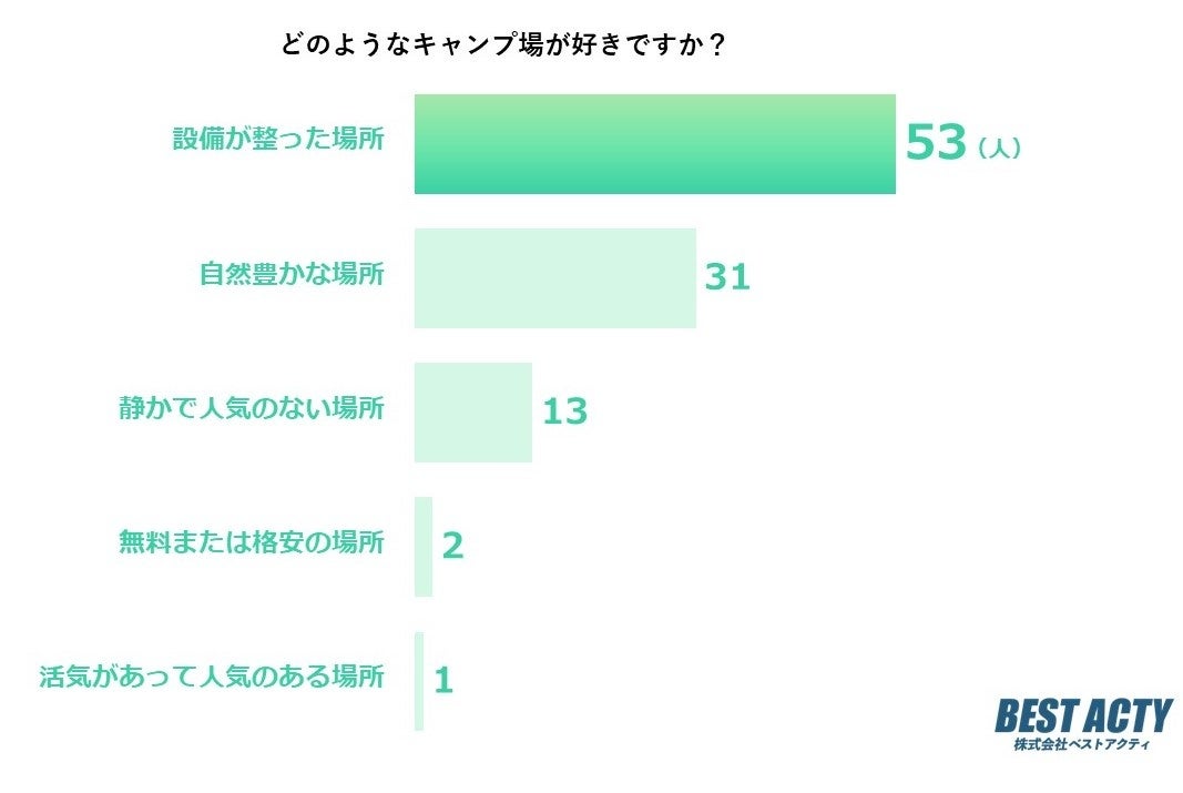 キャンプ場の好みについて100名にアンケートを行ったところ、「設備が整った場所」と回答する人が半数を占め、最も人気でした。