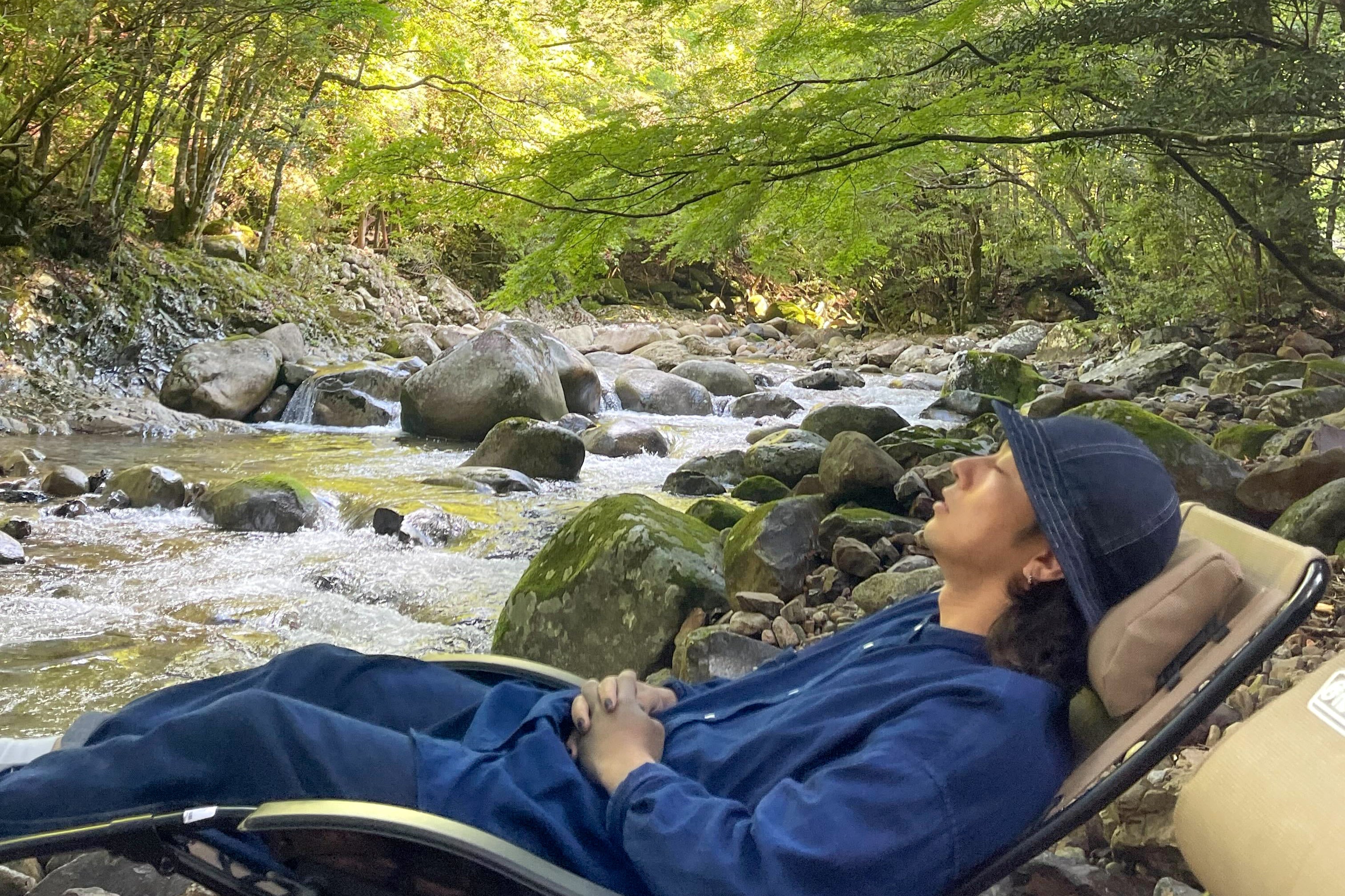 サウナ後の水風呂は横に流れる滑床渓谷の清流へ