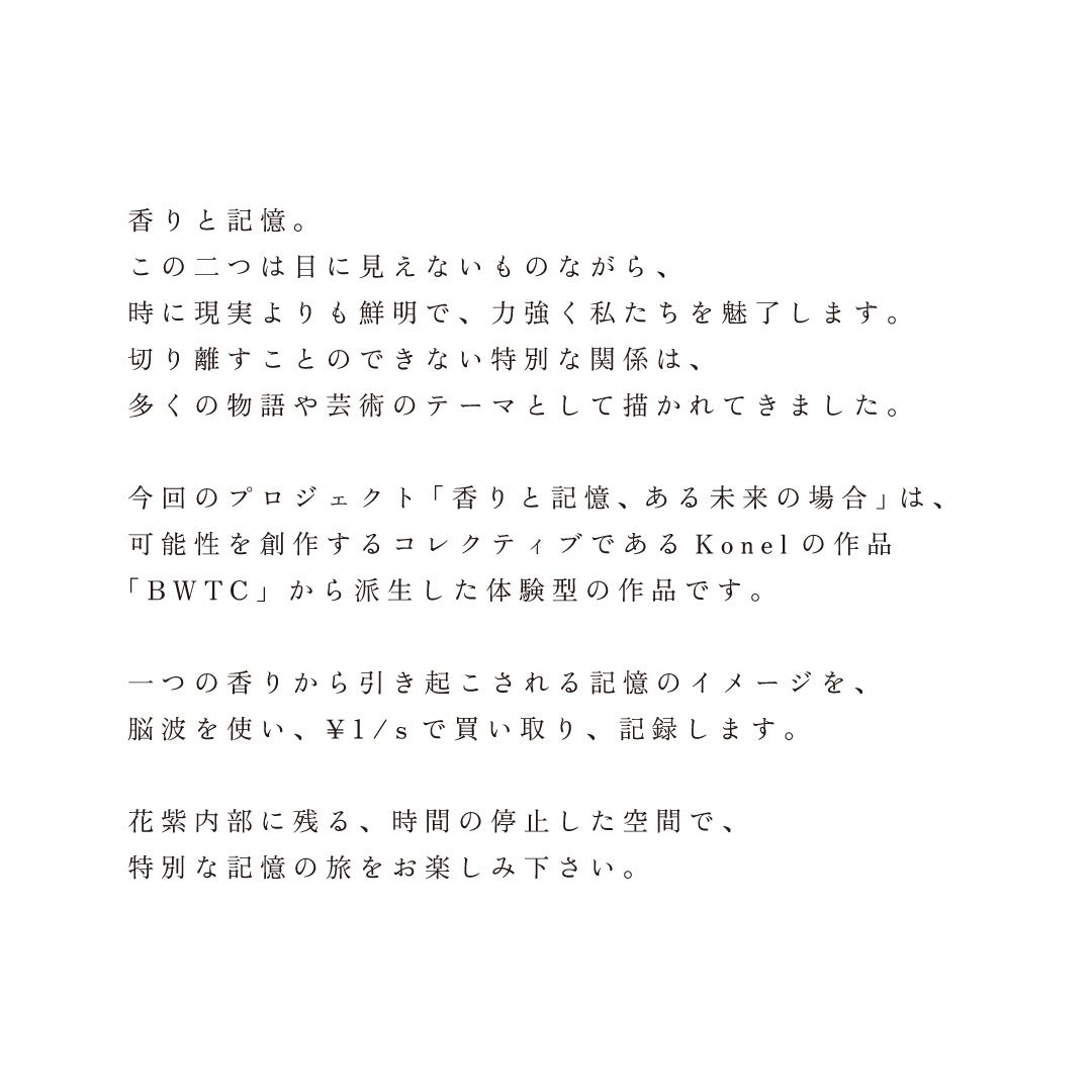 今回のプロジェクト「香りと記憶、ある未来の場合」は、可能性を創作するコレクティブであるKonelの作品「BWTC」から派生した体験型の作品です。
