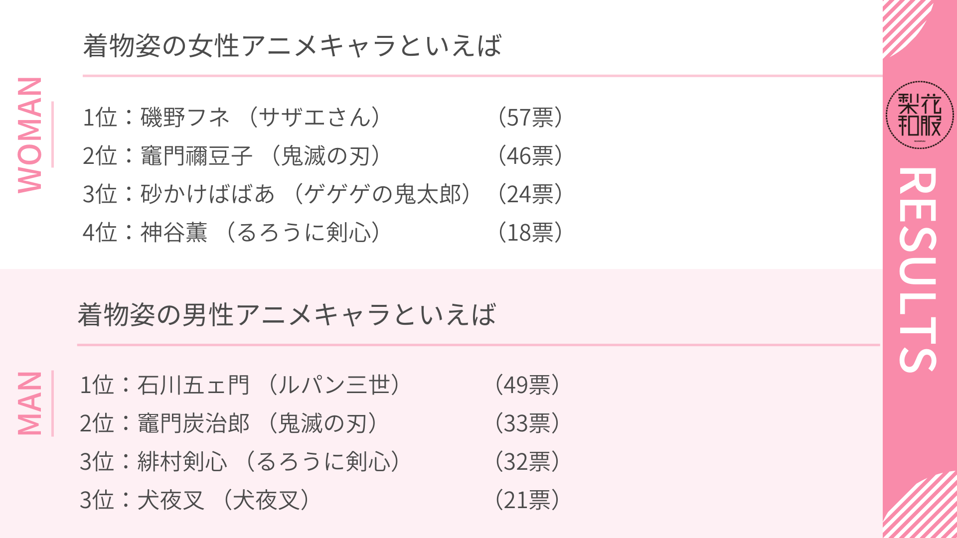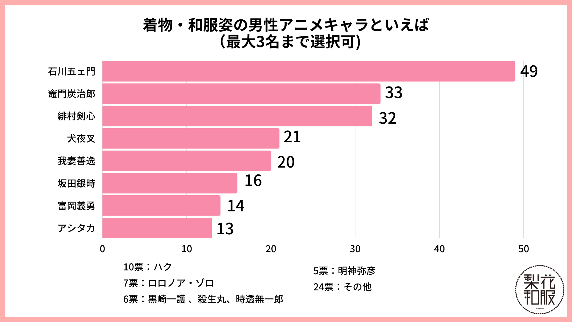着物・和服姿が印象的な男性アニメキャラとして、1位は石川五ェ門(49票)、2位は竈門炭治郎(33票)、3位は緋村剣心(32票)という結果になりました。