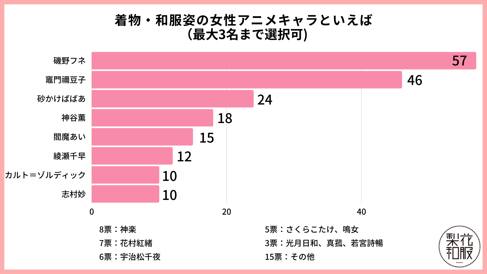 着物・和服姿が印象的な女性アニメキャラとして、1位は磯野フネ(57票)、2位は竈門禰豆子(46票)、3位は砂かけばばあ(24票)という結果になりました。