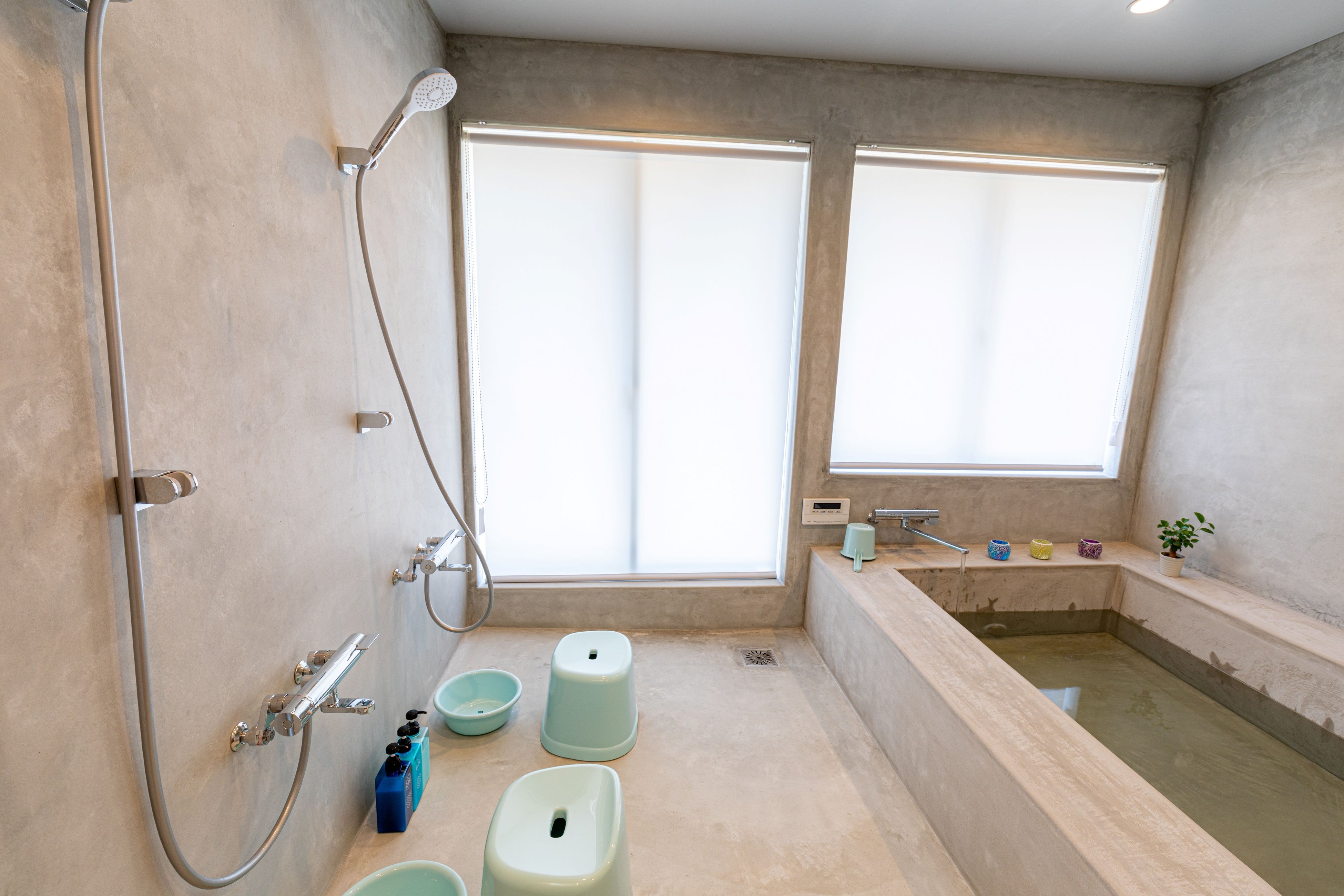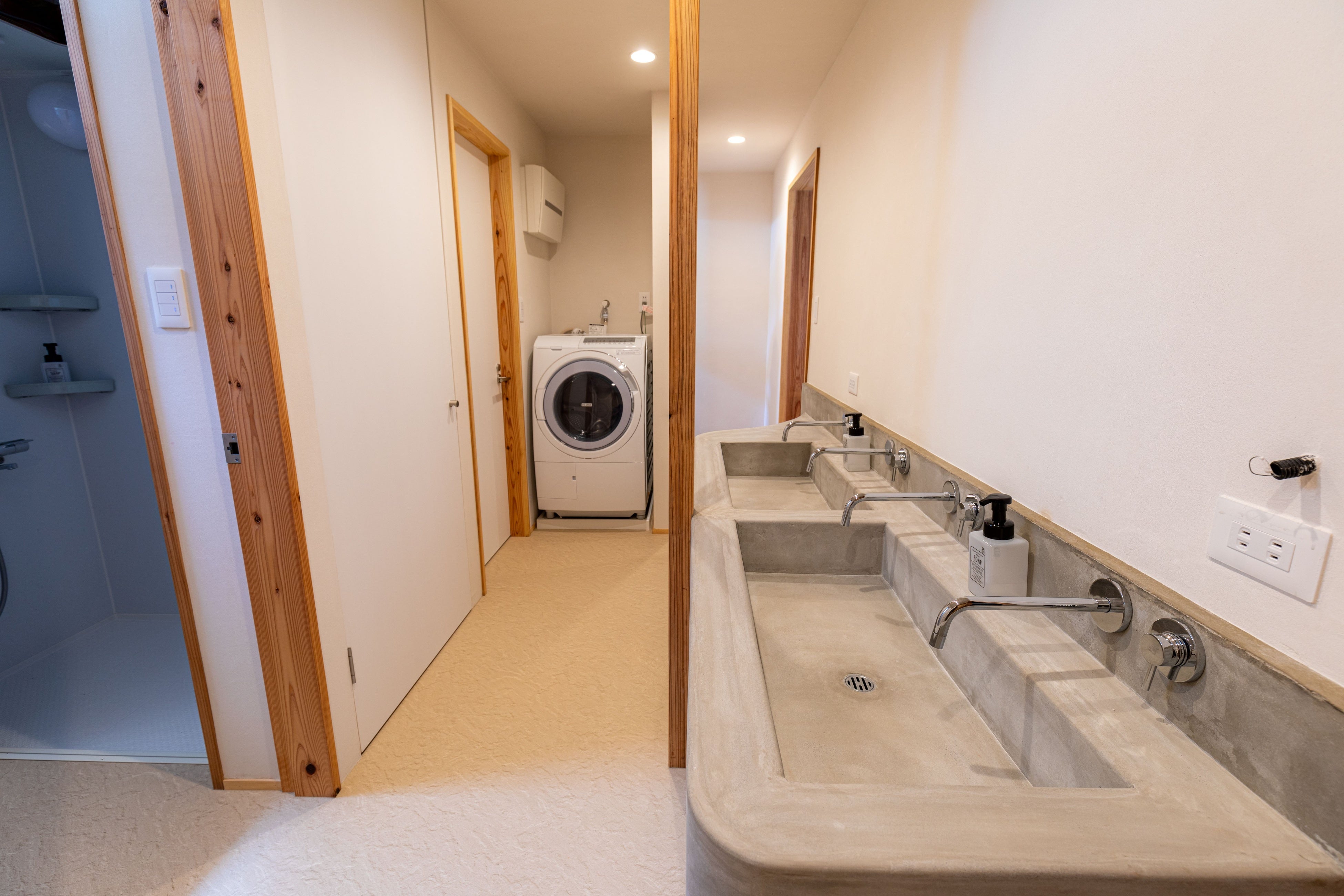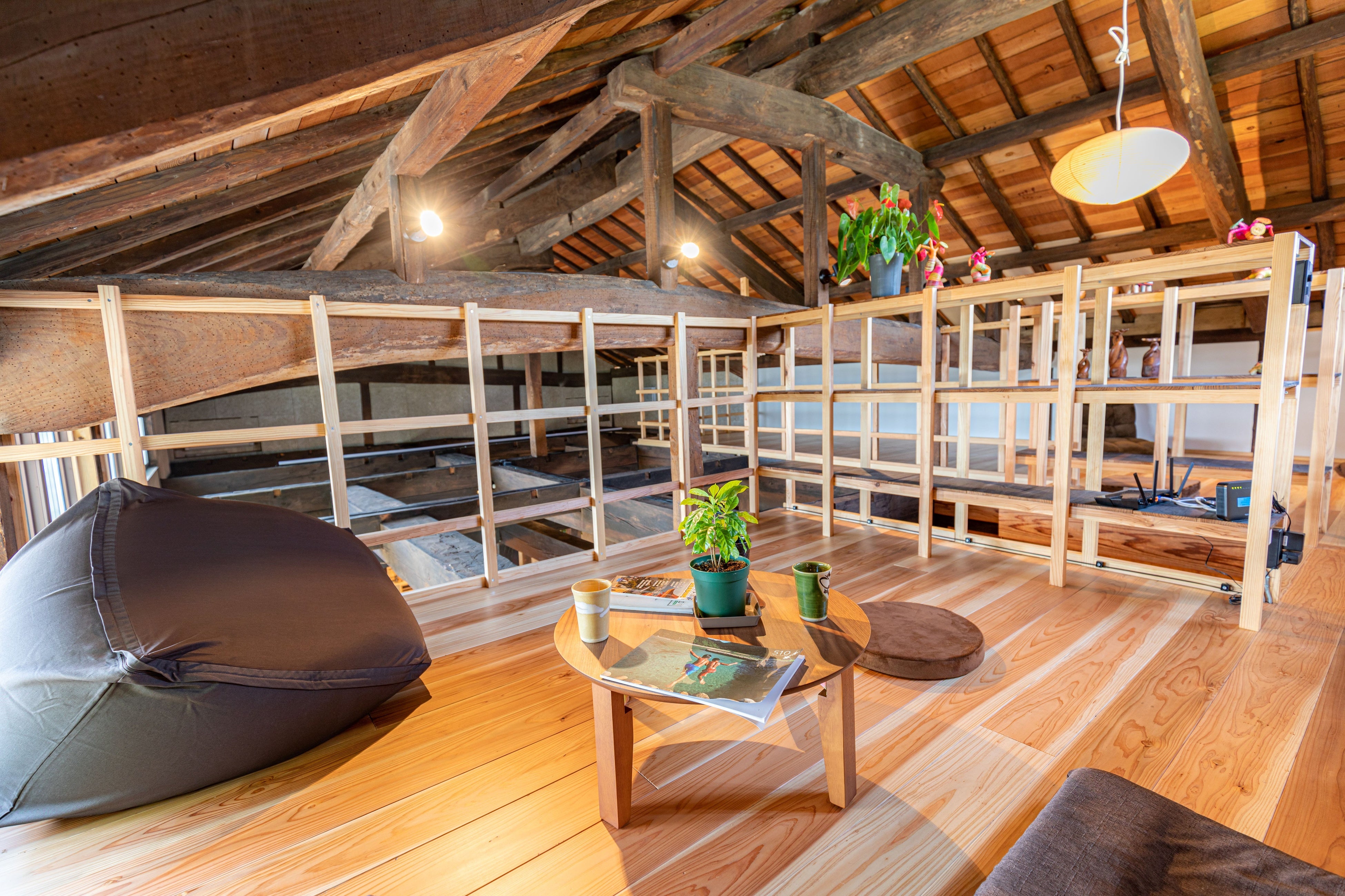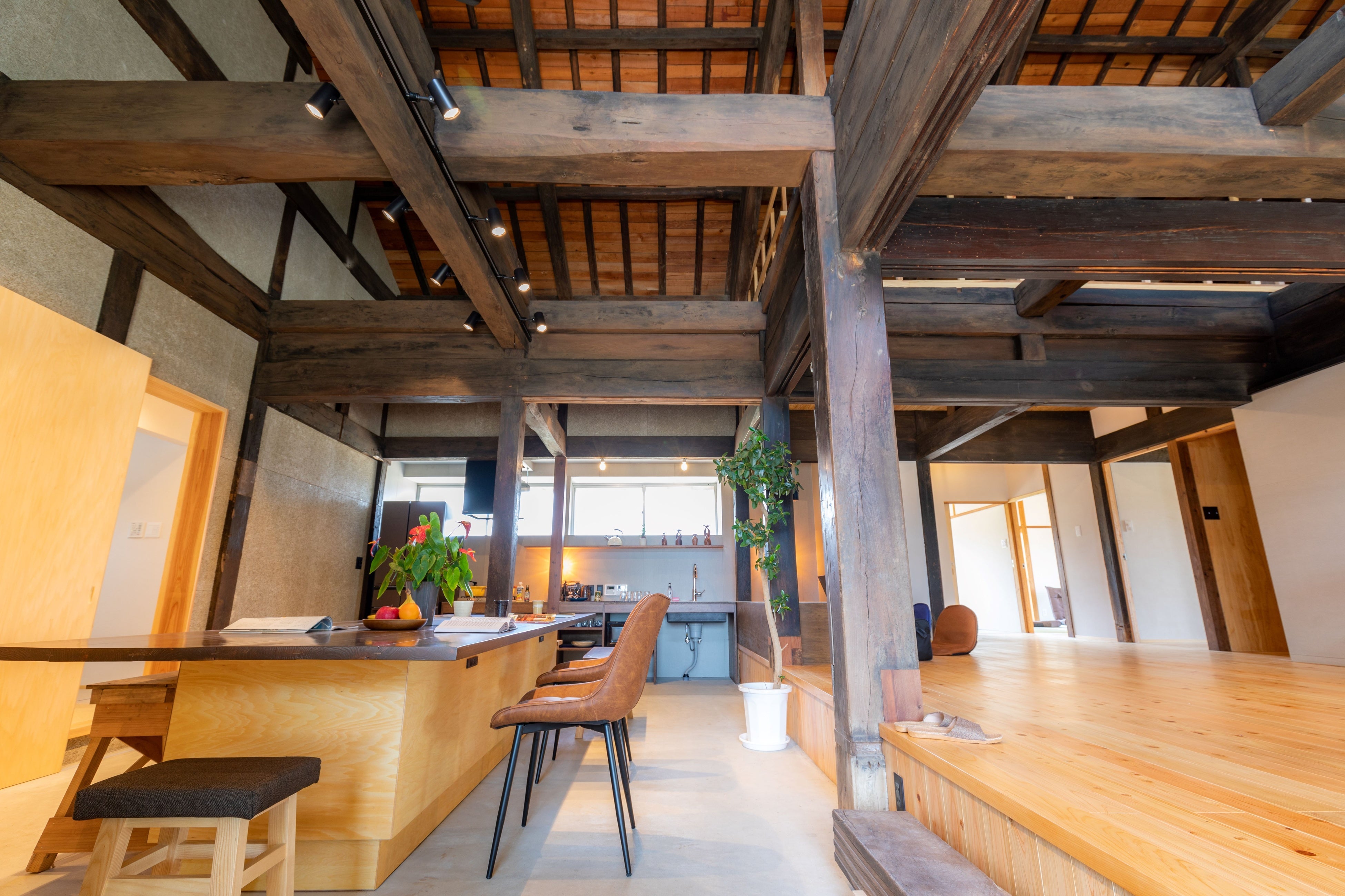 建物の柱梁がとても立派であったため、大きく間取りは変更せず、中央に吹き抜けの土間を設え、屋根裏を含めてできるだけワンルームのような空間としました。そこに大きな囲炉裏テーブルやL字型のキッチン、左官仕上げの洗面台や浴槽、古材を再利用した本棚など、大人数でもいっしょに使えるような居場所を分散配置しました。また庭には教室棟を増築し、連続的につながるウッドデッキを設えました。