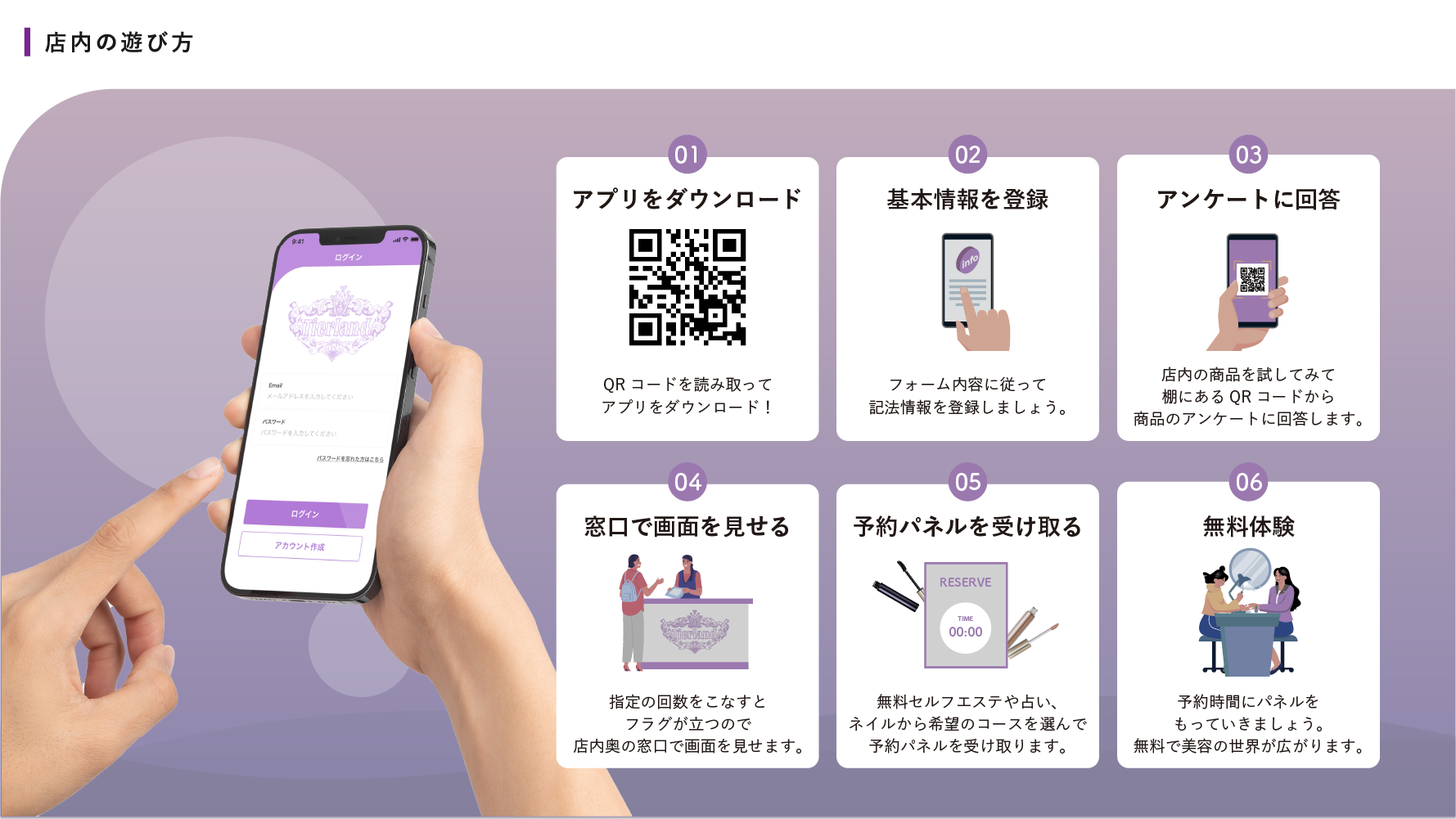 2022年11月4日に原宿竹下通りにオープンした、最新コスメや美容アイテムを体験すればエステやネイルが無料で受けられる“体験型美容テーマパーク”です。100種類ほどの商品の中から好みの商品を体験し、アンケートに答えたり口コミを発信したりすると、無料でジェルネイルやセルフエステ、肌診断、パーソナルカラー診断などが受けられます。Z世代を中心とした潜在顧客に対して様々な美容の体験を提供し、将来的な各ブランドへの顧客層の発掘を狙います。